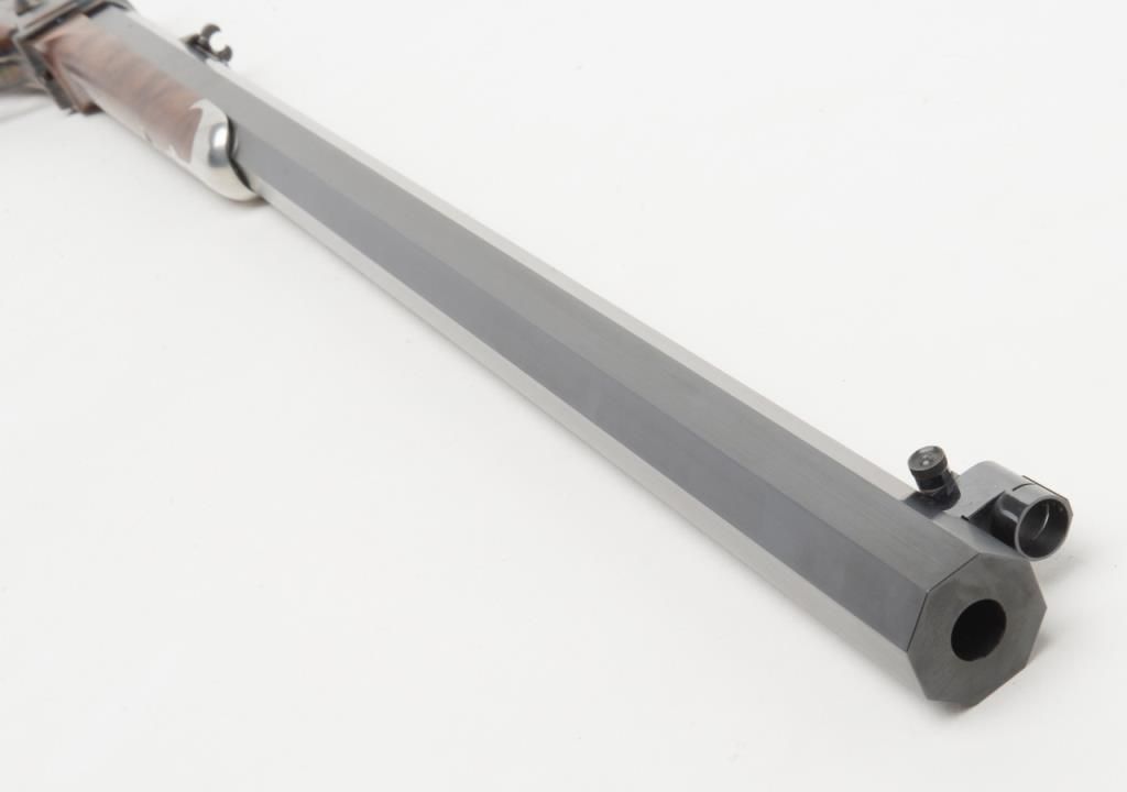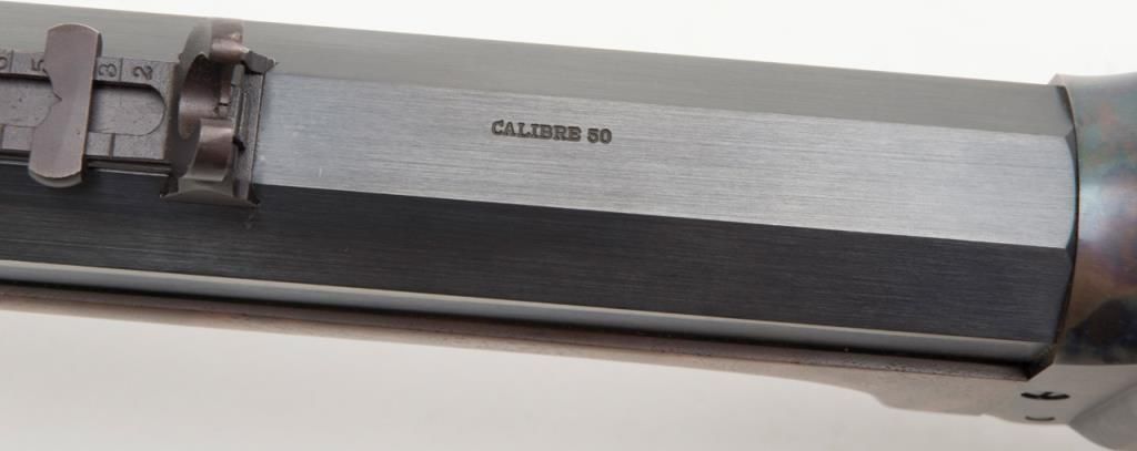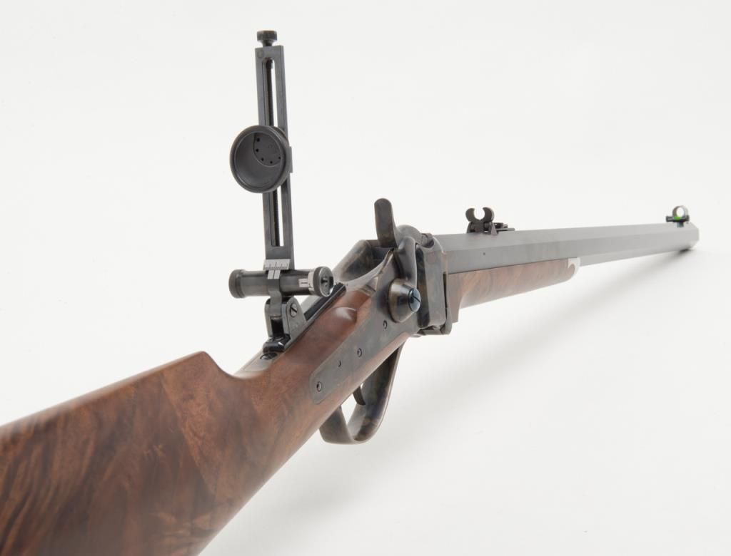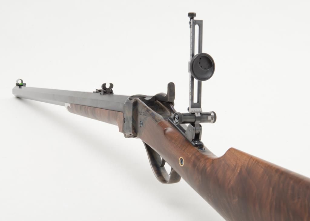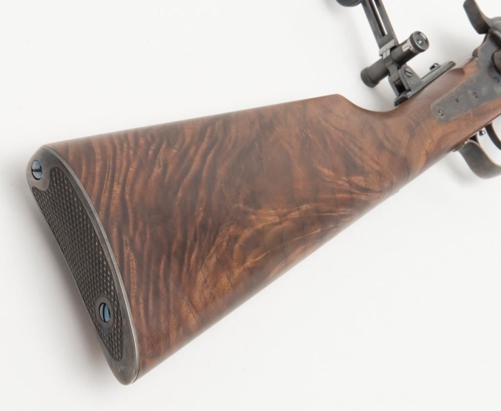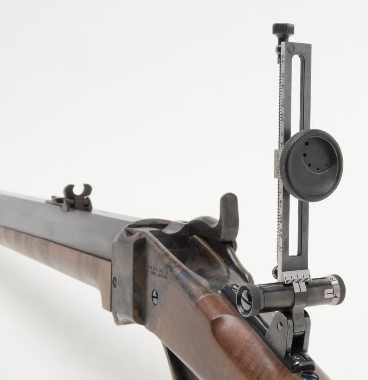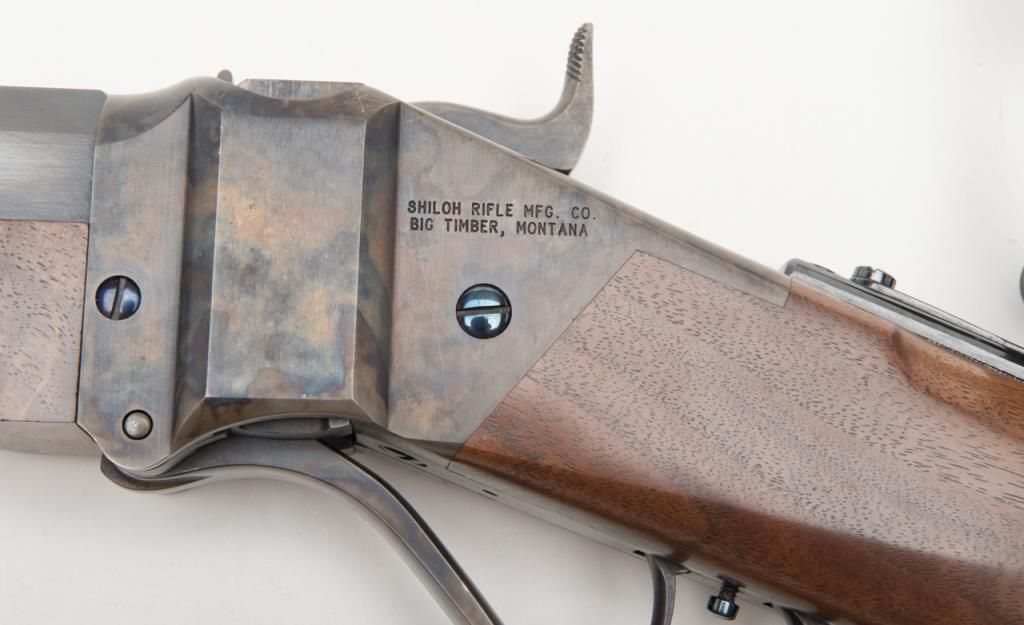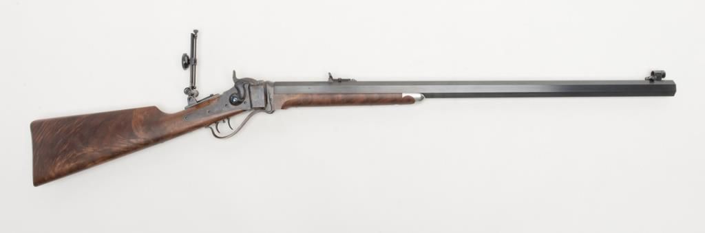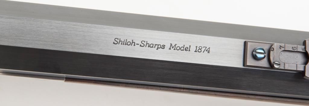 Massive Shiloh Sharps Model 1874 Sporting rifle, .50 caliber, 2-1/2” case, 30” extra heavy octagon barrel, blue and case hardened finish, deluxe wood straight stocks with pewter fore end tip, checkered steel butt plate, double set triggers,buckhorn rear sight, hooded front sight with spirit level, adjustable Vernier tang sight with circular adjustable eye piece, #4382B. This gun is in overall excellent condition showing little use or handling, approx. 99% original blue finish tobarrel and approx. 99% original vivid case colors on receiver, hammer and loading lever; wood is also excellent with beautiful flame graining; accompanied leather covers for the front and tang sights with beaded draw strings. In blackhardcase. Est.: $1,750-$3,500.