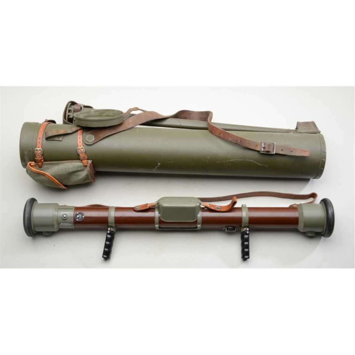 Massive Swiss Artillery Spotting Scope/Range Finder, approx. 37” long with tripods, associated parts/equipment and instructions pamphlet. This great conversation piece for the military collector is in overall verygood to fine condition with leather carry strap, protective metal cylindrical container for the scope plus protective sleeves for accessory parts. According to accompanying instructions, this rangefinder is good formeasuring ranges comprised between 300 and 30,000 meters; instructions explain operation, use of set-up for prone and kneeling positions and even a conversion table for meters to yards; be the first inyour block to have one of these! Est.: $500-$1,000.