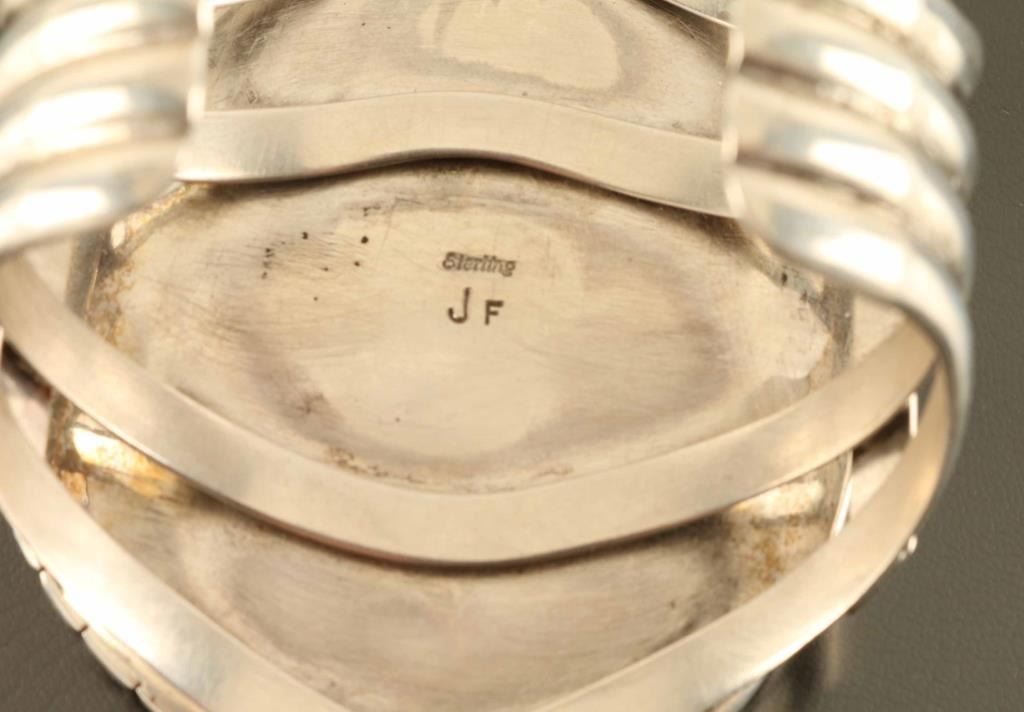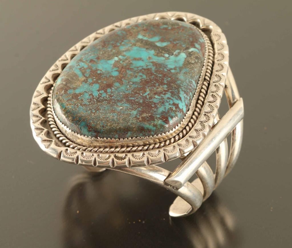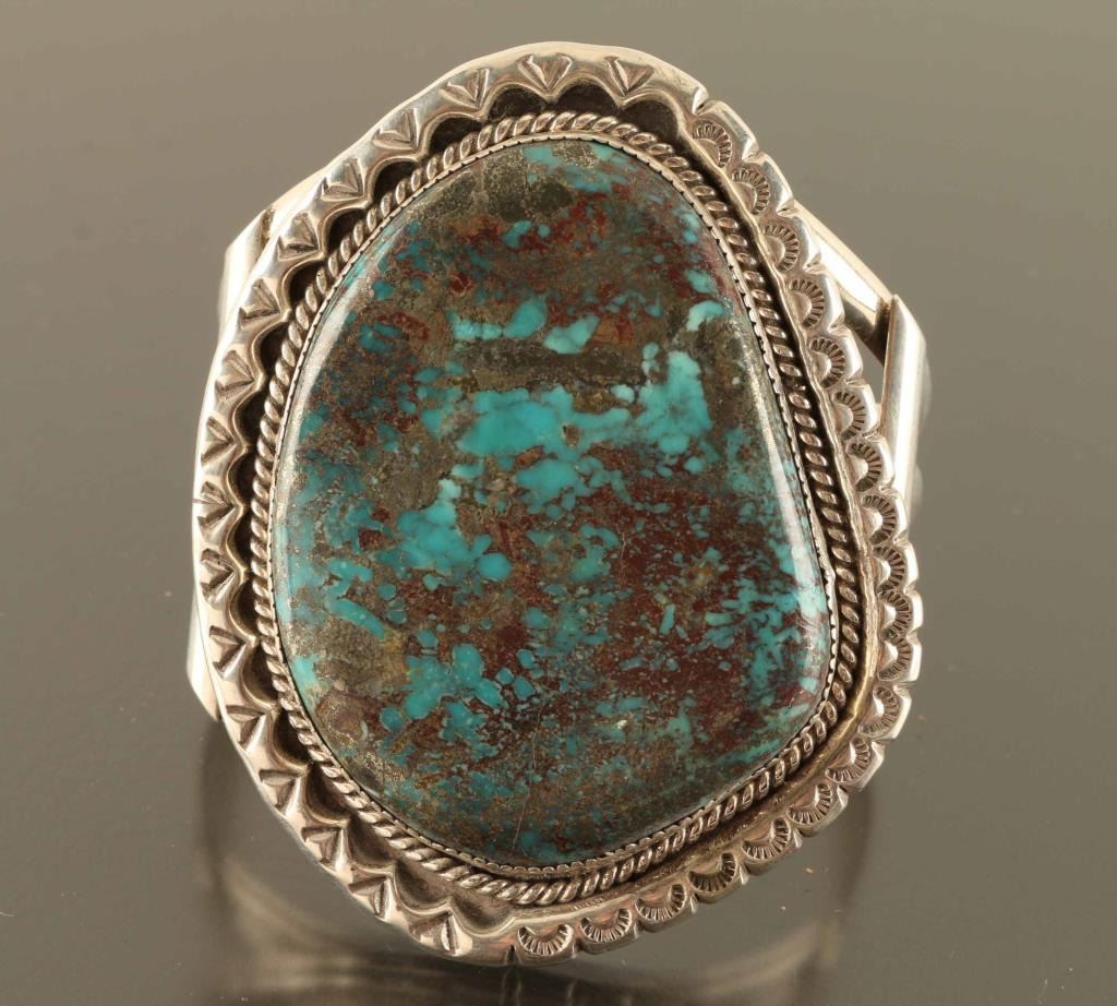 looks to be Nevada turquoise stone set in sterling made and marked by Johnny Fuson .From the Spike Flanders collection Silver City New Mexico.
