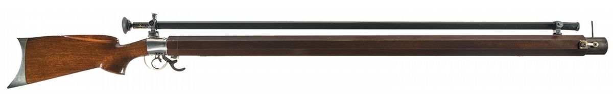 The massive barrel is fitted with a 47 inch sighting tube with a rubber eye piece and rear ring that is adjustable for elevation and windage. There is a 1 5/8 inch tall post front sight and a swivel hook on each side of the muzzle, (purpose unknown at this time) and there is a 5/8 inch square, 6 1/4 inch piece of iron attached to the bottom barrel flat 8 1/2 inches back of the muzzle for stability. Under hammer action with a bright alloy receiver and mounted with a smooth pistol grip stock with a cheek piece and aluminum buttplate. The rifle weighs 49 1/2 pounds.