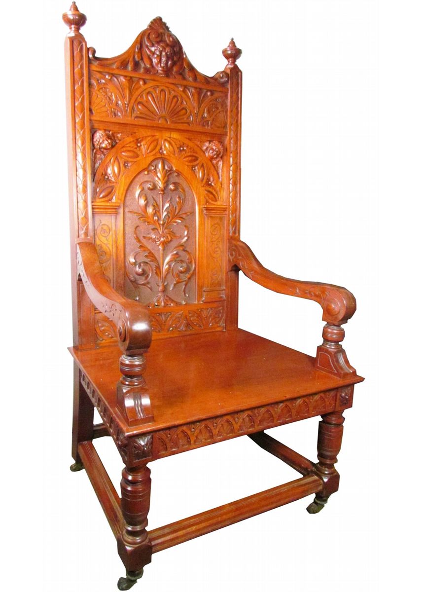 Massive Walnut Chair with Carved North Wind figure and Cherubs Motif. Excellent original condition. 56 1/2 X 28 X 26 inches.
