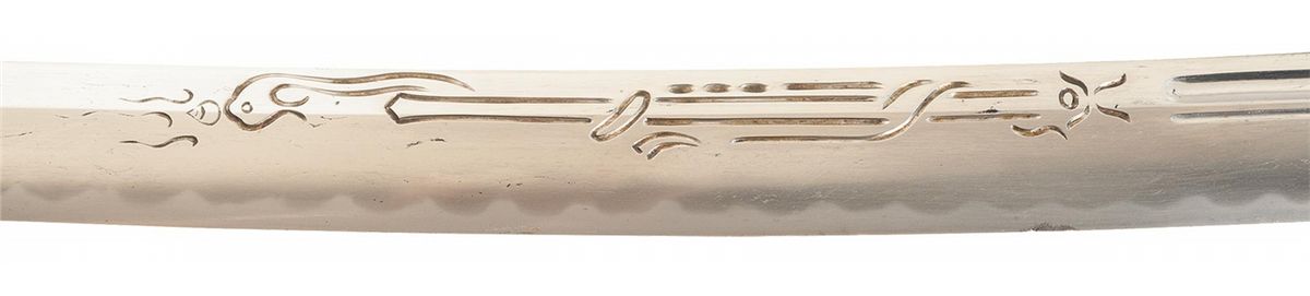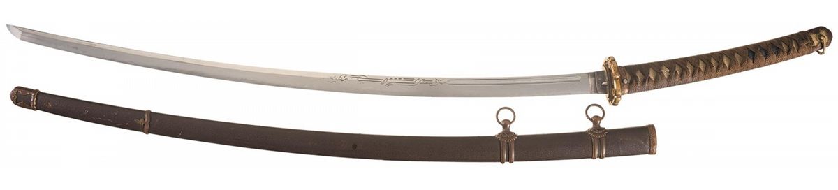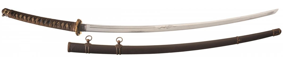 Representing one of the greatest challenges to Japanese sword-making methods, the Odachi ("great sword" or "big sword", an honest name however you translate it) was a massive weapon that pushed the limits of traditional techniques of folding, quenching and sharpening steel, producing one of the most distinctive weapons wielded by a warrior on horseback anywhere on Earth. Manufactured from the early days of traditional Japanese swordsmithing up to the 1600s, most of these blades fell victim to the changing styles and regulations concerning swordplay, with shorter blades that could be brought into play faster and used easier on foot being sought out, and many odachi being shortened to meet this need. Not only has this blade not been shortened, retaining an impressive 36 inch length, but has been mounted in a semi-custom shin-gunto style; most antique blades mounted this way were shortened to a katana-length, nearly a foot shorter than this choice example. The edge of the blade displays a highly attractive hamon, starting with a rolling wave kissaki towards the tsuba and becoming more irregular out towards the tip, and sharply executed asymmetrical decoration on each side; the right side shows a pair of 11 1/2 inch kesso of equal width leading to a 3 1/2 inch long cloud horimono, and the right side showing a pair of 8 inch kesso, one thin and one wide, leading to a 7 inch horimono of a serpent wrapped around a staff, and lightly engraved silver habaki. The shin-gunto tsuba is gilt brass in the traditional 4-lobed style with chrysanthemum ornamentation and silver and bronze seppa, and a fine brown silk cord is wrapped over the white rayskin and the darkened bronze menuki, which each bear three family mons. The mon, a series of three overlaid diamonds, is the symbol of the Ogasawara Clan, part of the Tokugawa Clan's inner circle of allies and vassals, namesake of the Ogasawara Islands (aka the Bonin Islands), and originators of the "Ogasawara-ryu" school of combat and etiquette, which would be a massive influence of the development of the manners and protocols of Japanese nobility, helping to shape the historical path and modern image of the Japanese warrior. Dismounting the tsuka shows the type of aging one would expect from such an ancient style of blade, with faint traces of signatures present on both sides and an overall length of 47 inches. The saya is wood construction with a textured brown lacquer finish, brass fittings with gilt accents, and dual floral pattern suspension bands.