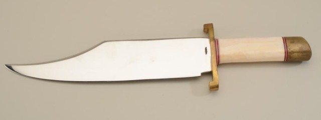 Massive clip point Bowie knife by Cooper showing his deep stamp and marked “REP” on guard for Robert E. Petersen; approx. 18-3/4” overall with 13” blade showing ivory grip; Cooper’s knives were featured in manyPetersen publications in the 1960s and 70s when this knife was presented. From the estate of Robert Petersen where it was displayed prominently in his living room. Est.: $600-$1,200.