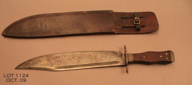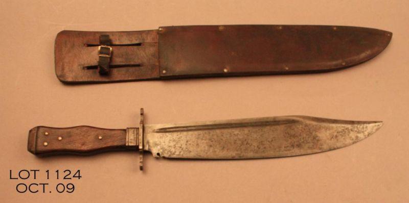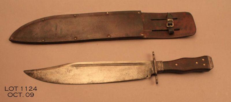 Massive copy of a clip point bowie knife with heavy leather riveted sheath, approx. 18-1/2” overall with a 12-1/2” blade showing blood groove, iron cross guard, wood grip with brass decorative pins and an iron cap pommel. The sheath is plainbut well made. Est.: $150-$300.