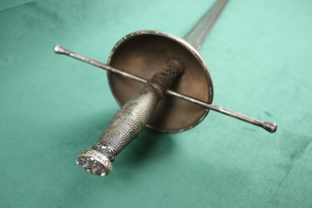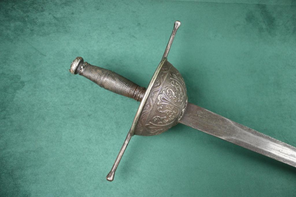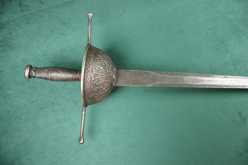Massive decorative two-hand broad sword made from parts approx. 59” overall with an approx. 41” scalloped blade, modern carved wood grip; would make a great medieval display piece! Est.: $350-$700.
