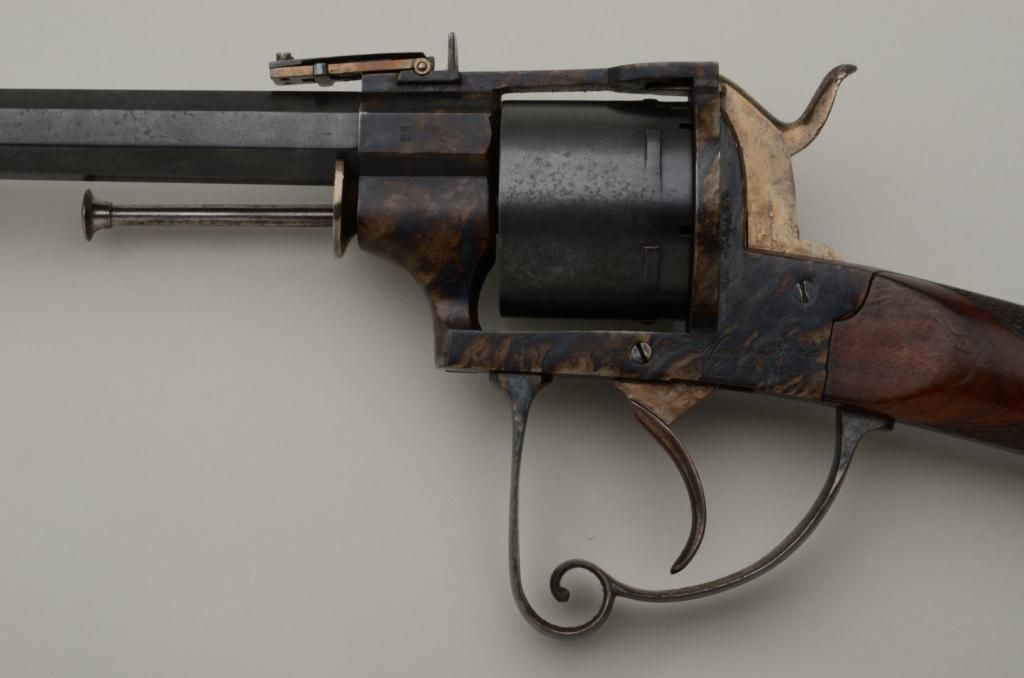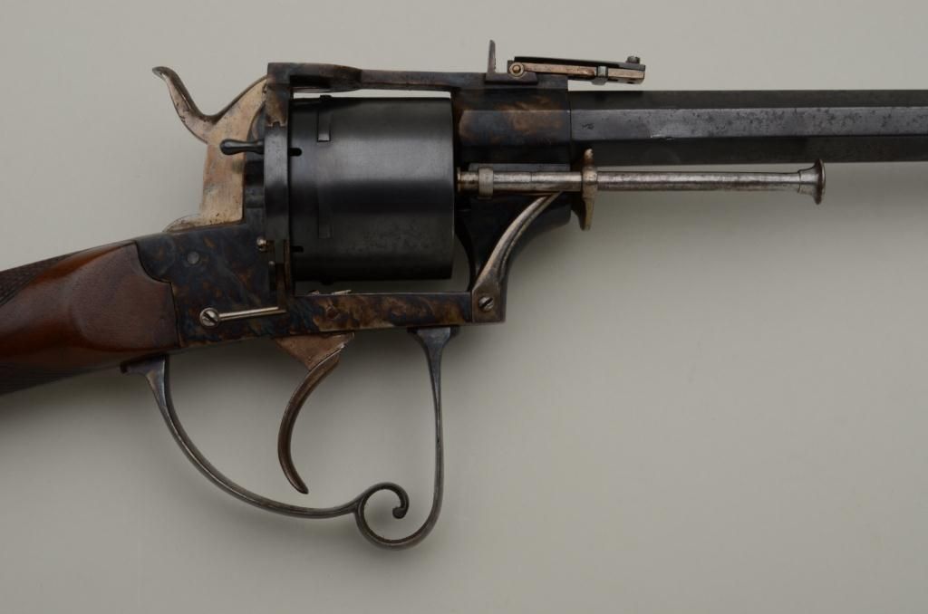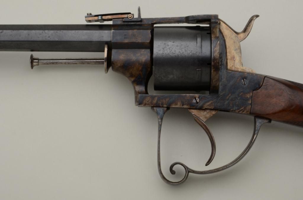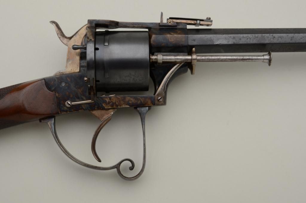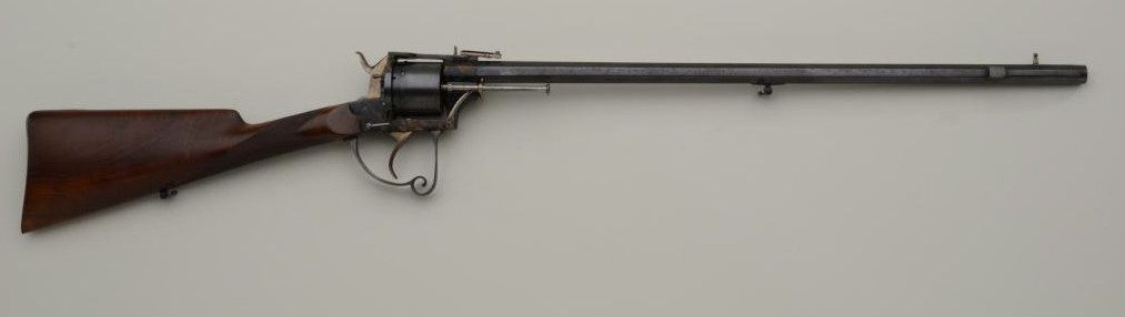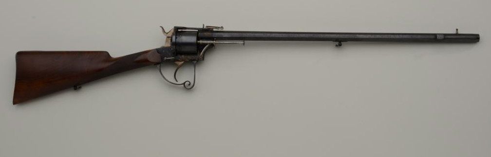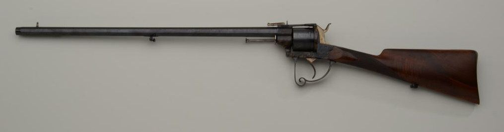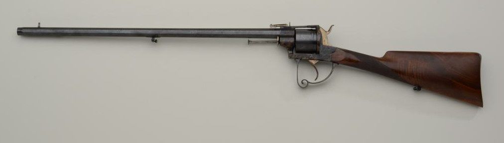 Massive double action pin-fire carbine signed “Mimers Brevete No. 10300” on left side of frame and also stamped “Mimers” etc. on left top flat of frame. The carbine shows a octagon barrel measuring 25 ¼” with stud onthe right side for saber type bayonet. This pin-fire is double action and shows a folding rear sight and a ejector on right side of frame. The gun has a nicely checkered select walnut stock and sling swivels. The bore is14mm plus and rifled of almost .56 caliber. The carbine is 42” overall. The metal surfaces show an old European quality refinish of which 95% remains showing some minor pitting and erosion along the flats ofthe barrel. The frame and mounts also have been beautifully European quality re-cased hardened. The trigger and hammer show original straw type finish. Stocks are near fine as refreshed and the action is good andthe interior is at least very good. Pin-fire carbines are unusual but this is the largest rifled specimen we have ever cataloged and it was produced at about the time of the Civil War and very possibly could’ve been imported
