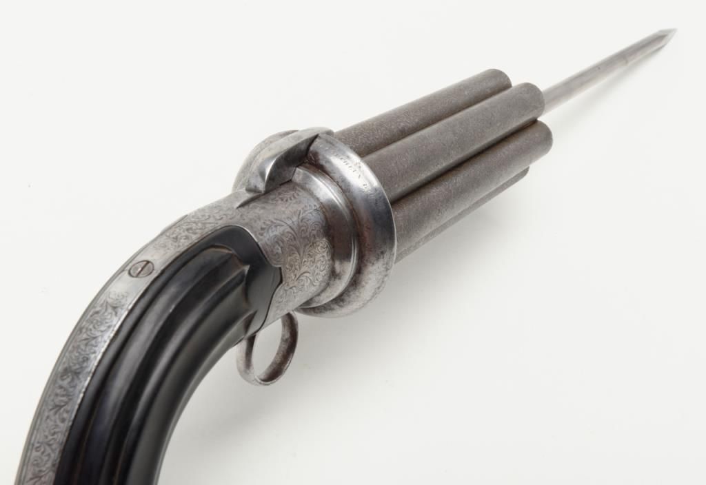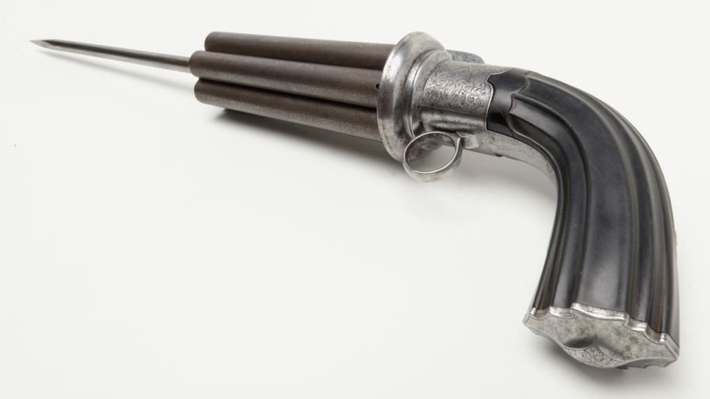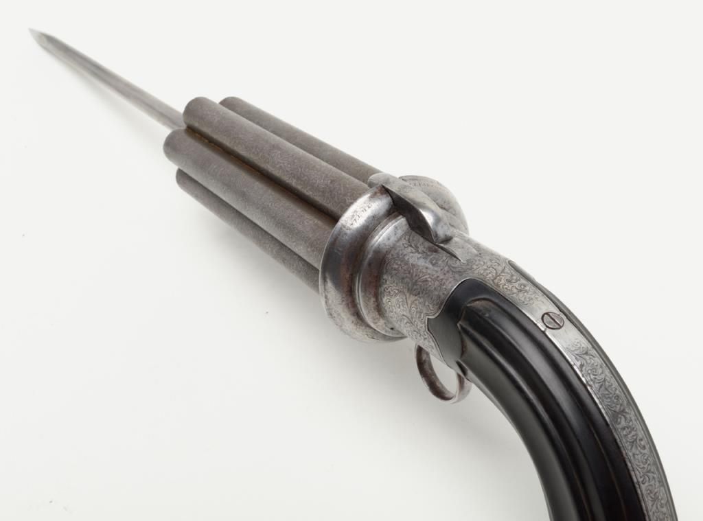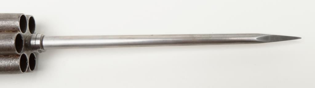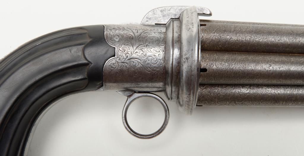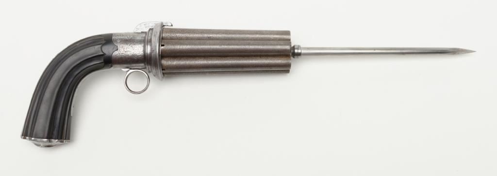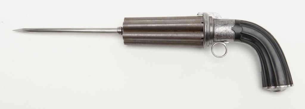 Massive double action pinfire pepper box with ebony grip and spike type removable bayonet. This pepperbox revolver measures nearly 12” overall with 5 ½” barrel group and is 6 shot of approximately 12.5 mm pin fire with smoothbore.This pistol remains in very good plus to near fine original condition showing Damascus pattern barrels and bright metal mounts. The barrels show most of their original pattern and just some beginning aging with slight staining on the frameand mounts. The condition is at least very good plus to near fine overall. The fluted ebony grip is of generous proportion and measures almost 5” from the frame around the curve and is a handful for even the largest hand. The bayonet spike is areplacement. The largest pinfire pepper box we have ever catalogued and is probably French in origin though no makers name or proofs. Est.: $3500-$7000