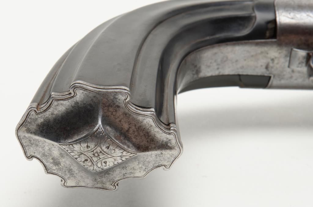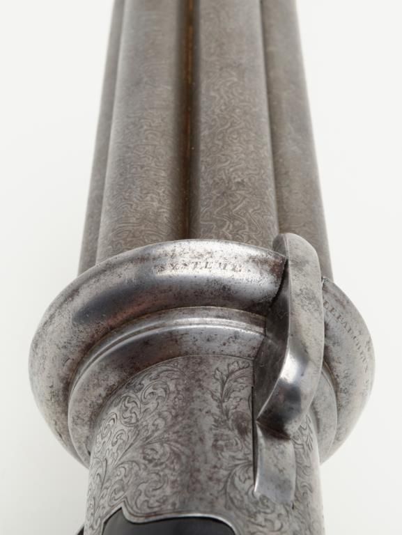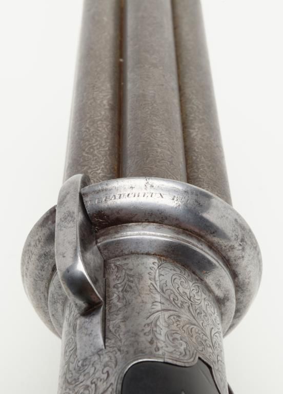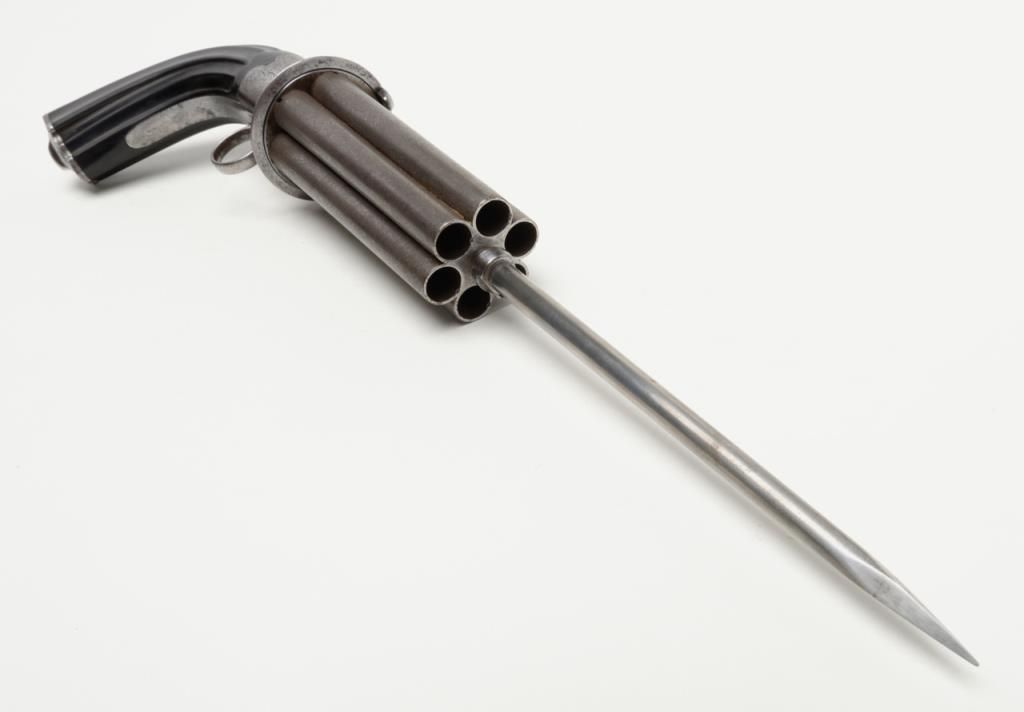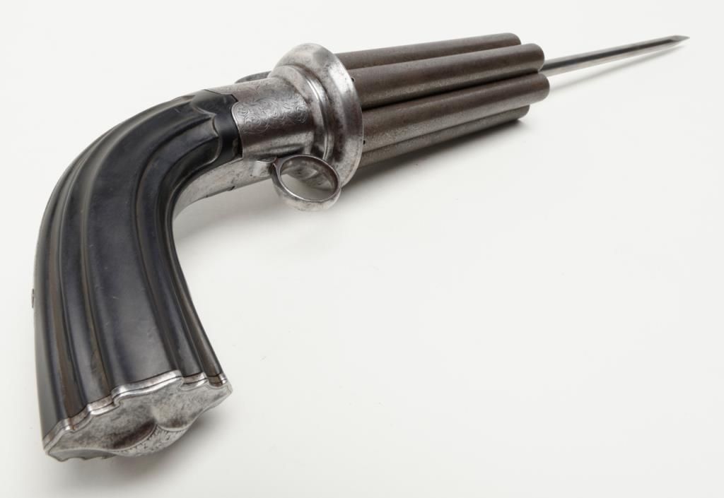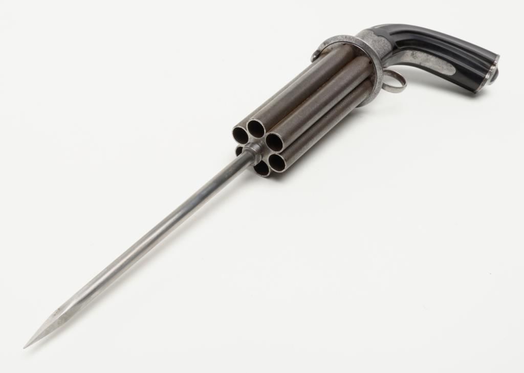 Massive double action pinfire pepper box with ebony grip and spike type removable bayonet. This pepperbox revolver measures nearly 12” overall with 5 ½” barrel group and is 6 shot of approximately 12.5 mm pin fire with smoothbore.This pistol remains in very good plus to near fine original condition showing Damascus pattern barrels and bright metal mounts. The barrels show most of their original pattern and just some beginning aging with slight staining on the frameand mounts. The condition is at least very good plus to near fine overall. The fluted ebony grip is of generous proportion and measures almost 5” from the frame around the curve and is a handful for even the largest hand. The bayonet spike is areplacement. The largest pinfire pepper box we have ever catalogued and is probably French in origin though no makers name or proofs. Est.: $3500-$7000
