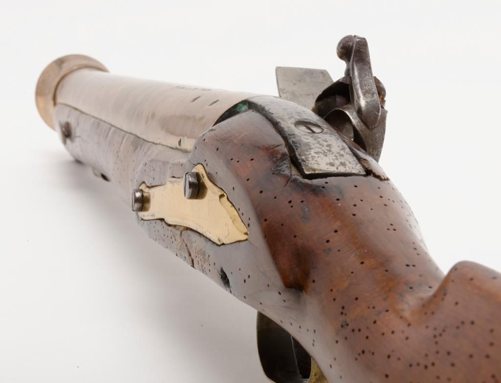 Massive flintlock naval style rail gun with cast naval brass cannon type barrel. The barrel is engraved in block letters “Liverpool” showing British proofs. The gun measures 40” overall with a 8 ½” in length lock plate of generousproportions. The barrel measures 3” to the outside diameter with a nearly 2 ¼” bore. The gun weighs approximately 32.5 pounds. The metal surfaces are in good condition with the frizzen showing resurfacing from a good deal of use. The lockretains its original hammer and small parts. The stock shows worming and breaks with some filler and repairs. The name Liverpool on the barrel may have been the name of a ship. This was really a fast and portable one man operated cannon foranti-personal use. Est.: $5,000-$10,000
