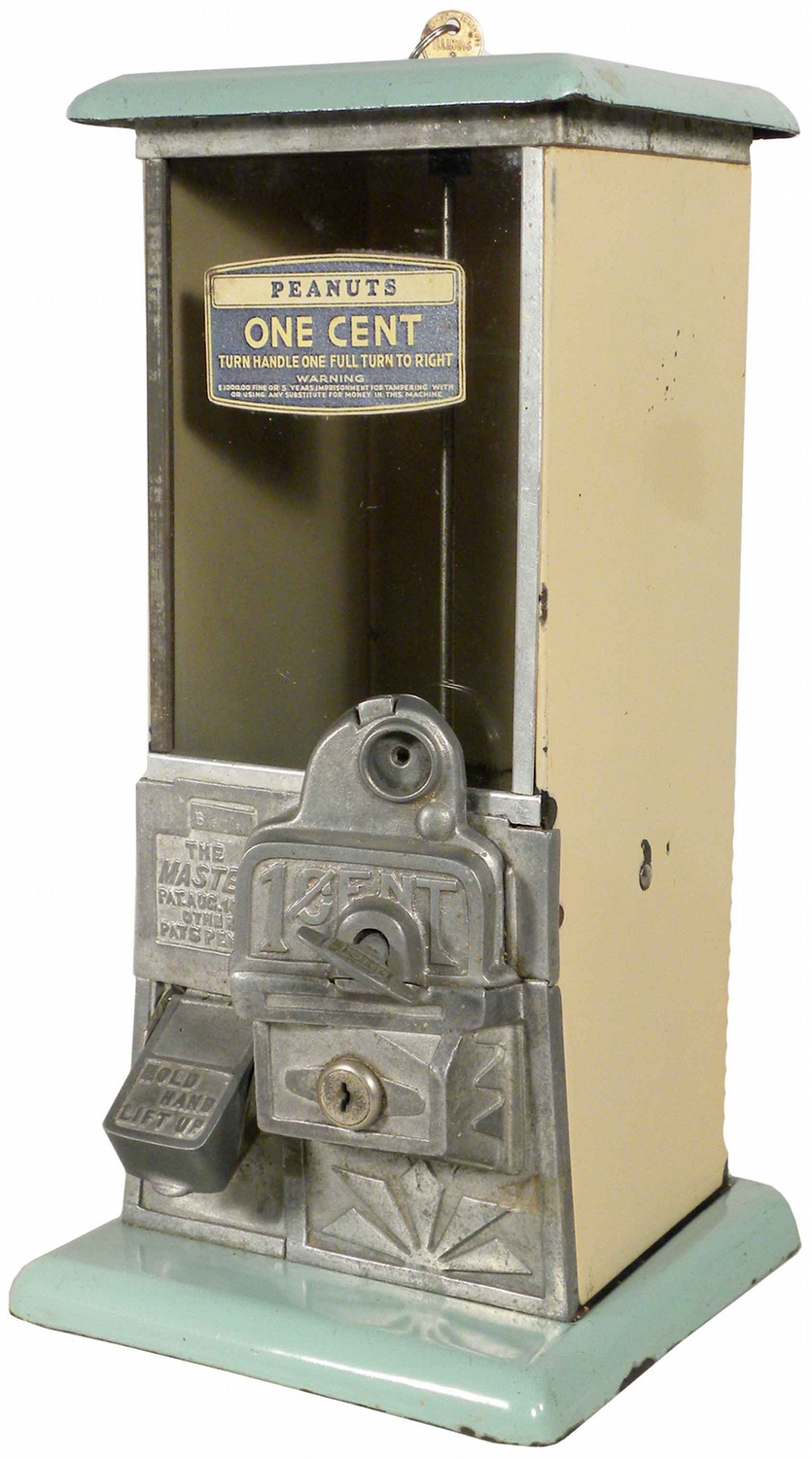 Master 1 Cent Peanut Vendor. Porcelain w/aluminum. Very good condition, comes with key. 16 inches tall.