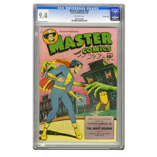 <B>Master Comics #101 Crowley Copy pedigree (Fawcett, 1949) CGC NM 9.4 Off-white pages.</B></I> If there was a better cover than this one in <B>Master Comics</B></I>' run, we'd like to see it! The Captain Marvel Jr. feature is accompanied by Bulletman, Tom Mix, and Nyoka the Jungle Girl stories. Overstreet 2005 NM- 9.2 value = $160. CGC census 12/05: 2 in 9.4, 1 higher.