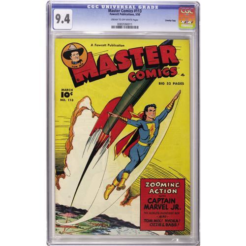 <B>Master Comics #113 Crowley Copy pedigree (Fawcett, 1950) CGC NM 9.4 Cream to off-white pages.</B></I> Tom Mix story. Overstreet 2006 NM- 9.2 value = $160. CGC census 10/06: 1 in 9.4, none higher.<BR><BR><b>Shipping:</b> Slabbed Comic (<a target="_blank" href="http://www.heritageauctions.com/common/shipping.php">view shipping information</a>)