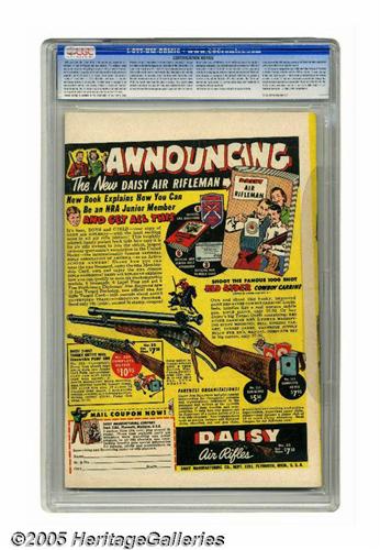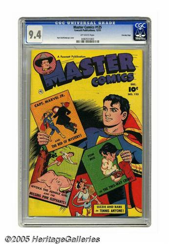 <B>Master Comics #125 Crowley Copy pedigree (Fawcett, 1951) CGC NM 9.4 Off-white pages.</B></I> Overstreet notes, "lower print run." Kurt Schaffenberger cover. Overstreet 2005 NM- 9.2 value = $160. CGC census 6/05: 2 in 9.4, none higher.