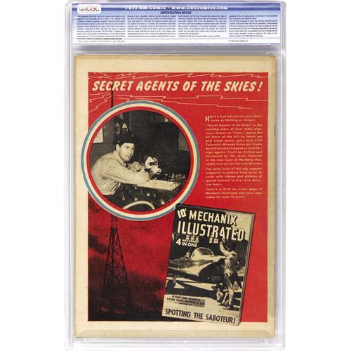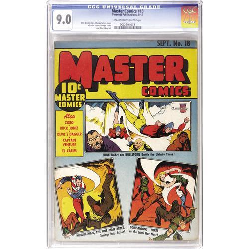 <B>Master Comics #18 (Fawcett, 1941) CGC VF/NM 9.0 Cream to off-white pages.</B></I> We had never seen this one in high grade before! The big names in the book are of course Bulletman and Bulletgirl, but the issue's also got some lesser-known Fawceteers like Minute-Man, the Companions Three, and Zoro (with <I>one</B></I> R, mind you), and El Carim (Miracle spelled backwards). The issue's artists include Mac Raboy. Overstreet 2006 VF/NM 9.0 value = $1,007; NM- 9.2 value = $1,375. CGC census 6/06: 1 in 9.0, 1 higher. <BR><BR><B>Important notice:</B> Heritage usually auctions material at the rate of 200-250 lots per hour. On some occasions eBay Live bid software or the Internet may not be able to keep up with the pace of the auction. We recommend placing a realistic absentee bid now as insurance to avoid disappointment. Occasionally the auctioneer may eliminate or reject an eBay Live bid, and the auctioneer may also reopen a lot after the close of the eBay live bidding (usually because we missed an audience bid), and may reject your bid even if it shows you as the winning bidder. By bidding via eBay Live, you agree that Heritage may award the lot to another bidder at its sole discretion under the circumstances described above or any other reasonable circumstances. Since eBay bids are not shown to us until we open the lot on the floor, we treat those bids just like floor bids. In most cases the floor responds before the eBay bid is presented to us, due to Internet lag time, so for consistency we have made it a policy that floor bids are always considered first over tie eBay live bids. Also please note that all Heritage lots purchased through eBay Live carry a 22.5% Buyer's Premium. Please make sure you read the Terms and Conditions before you bid. This lot is being auctioned in conjunction with a live floor auction by Heritage Auction Galleries. All final auction and invoice information will be supplied by Heritage Auction Galleries, and all other information should be considered preliminary. Lot:41001 <BR><BR><B>Winning Notification and Billing:</B> After the FINAL session in this auction is complete, Heritage will send e-mail and snail mail invoices. This process normally takes several days. All final auction and invoice information will be supplied by Heritage Auction Galleries, and all other information should be considered preliminary. <BR><BR>This auction will be conducted on a live auction floor and over the Internet through eBay Live. If you choose to place an absentee bid, please take a moment to <font color='#0000ff'><u><a href='http://pages.ebay.com/liveauctions/help/before/laabsentee.html'>learn how eBay Live absentee bidding works</a></u></font><font color='#000000'>