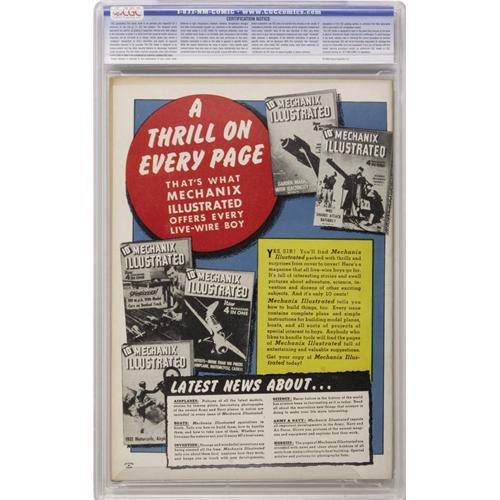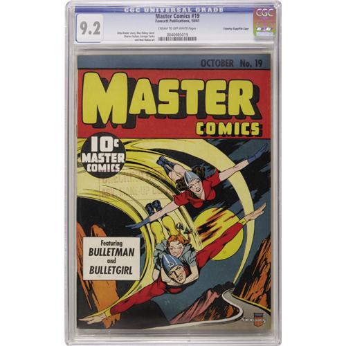<B>Master Comics #19 Crowley Copy/File Copy (Fawcett, 1941) CGC NM- 9.2 Cream to off-white pages.</B></I> The highlights in this pedigree copy include a Mac Raboy Bulletman and Bulletgirl cover, art by Raboy, Charles Sultan, and George Tuska, and a story by Otto Binder. This wonderful copy should attract heavy bidding. Overstreet 2006 NM- 9.2 value = $1,375. CGC census 10/06: 2 in 9.2, none higher.<BR><BR><b>Shipping:</b> Slabbed Comic (<a target="_blank" href="http://www.heritageauctions.com/common/shipping.php">view shipping information</a>)