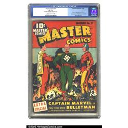 Master Comics #21 (Fawcett, 1941) CGC VF- 7.5 Cream to off-white pages. One of the scarcest, most desirable Fawcett comics in fandom, this issue features part one of the trilogy origin of Captain Marvel Jr., the first appearance of Captain Nazi, and Mac Raboy's first cover work for the company. The story continues in #22 and Whiz #25, which leads to the first appearance of Captain Marvel Jr. A very sharp copy with slight back cover soiling and minor edge wear. Overstreet 2002 VF 8.0 value = $3,150. Important notice: We expect to be auctioning lots at the rate of 200-250 per hour. Sometimes eBay Premier live bid software cannot keep up with that pace, so we strongly recommend that you place a realistic proxy bid now as insurance to avoid disappointment. Also please note that all Heritage/CAA lots purchased through eBay Premier carry a 20% Buyer's Premium. Please make sure you read the Terms and Conditions.