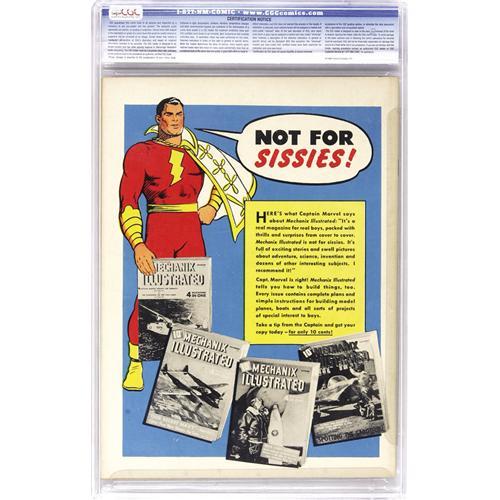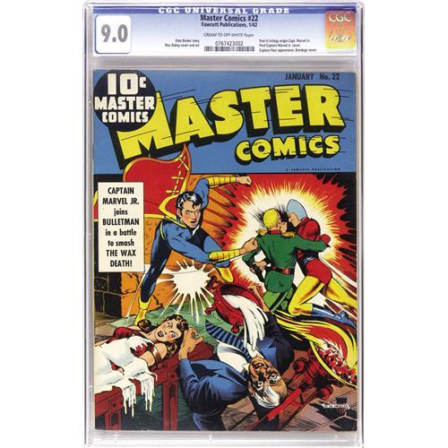 <B>Master Comics #22 (Fawcett, 1942) CGC VF/NM 9.0 Cream to off-white pages.</B></I> The first cover appearance of Captain Marvel Jr. is just his second appearance overall (after <B>Whiz Comics</B></I> #25) and his first actual adventure! And he's thrown right into the fray, teaming with Bulletman to battle Captain Nazi (who makes only his third appearance here). Junior would be the star of this series for the next eleven years straight, and he was always at his best when drawn by Mac Raboy, who provided the cover and interior art for this issue. Overstreet 2006 VF/NM 9.0 value = $5,343; NM- 9.2 value = $7,500. CGC census 6/06: 2 in 9.0, 2 higher. <BR><BR><B>Important notice:</B> Heritage usually auctions material at the rate of 200-250 lots per hour. On some occasions eBay Live bid software or the Internet may not be able to keep up with the pace of the auction. We recommend placing a realistic absentee bid now as insurance to avoid disappointment. Occasionally the auctioneer may eliminate or reject an eBay Live bid, and the auctioneer may also reopen a lot after the close of the eBay live bidding (usually because we missed an audience bid), and may reject your bid even if it shows you as the winning bidder. By bidding via eBay Live, you agree that Heritage may award the lot to another bidder at its sole discretion under the circumstances described above or any other reasonable circumstances. Since eBay bids are not shown to us until we open the lot on the floor, we treat those bids just like floor bids. In most cases the floor responds before the eBay bid is presented to us, due to Internet lag time, so for consistency we have made it a policy that floor bids are always considered first over tie eBay live bids. Also please note that all Heritage lots purchased through eBay Live carry a 22.5% Buyer's Premium. Please make sure you read the Terms and Conditions before you bid. This lot is being auctioned in conjunction with a live floor auction by Heritage Auction Galleries. All final auction and invoice information will be supplied by Heritage Auction Galleries, and all other information should be considered preliminary. Lot:41001 <BR><BR><B>Winning Notification and Billing:</B> After the FINAL session in this auction is complete, Heritage will send e-mail and snail mail invoices. This process normally takes several days. All final auction and invoice information will be supplied by Heritage Auction Galleries, and all other information should be considered preliminary. <BR><BR>This auction will be conducted on a live auction floor and over the Internet through eBay Live. If you choose to place an absentee bid, please take a moment to <font color='#0000ff'><u><a href='http://pages.ebay.com/liveauctions/help/before/laabsentee.html'>learn how eBay Live absentee bidding works</a></u></font><font color='#000000'>