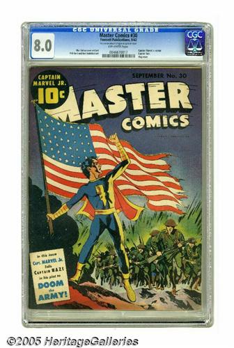 <B>Master Comics #30 (Fawcett, 1942) CGC VF 8.0 White pages.</B></I> It's pretty much straight-up good versus evil when Captain Marvel Jr. faces Captain Nazi. Mac Raboy drew the stirring flag cover and contributed interior art as well. CGC notes, "Very minor amount of glue on cover." Overstreet 2005 VF 8.0 value = $544. CGC census 4/05: 1 in 8.0, 1 higher.