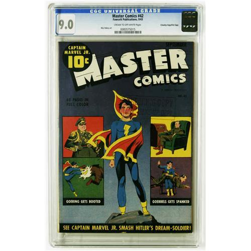 <B>Master Comics #42 Crowley Copy pedigree - File Copy (Fawcett, 1943) CGC VF/NM 9.0 Cream to off-white pages.</B></I> A majestic Captain Marvel Jr. stands tall on this Mac Raboy cover, which also features two high-ranking World War II Nazi officials getting their comeuppance from our young hero. "Checking Copy" has been lightly rubber-stamped on the front cover of this well-preserved example, which was found among Fawcett editor Wendell Crowley's impressive comic book collection. Overstreet 2005 VF/NM 9.0 value = $357; NM- 9.2 value = $623. CGC census 12/05: 2 in 9.0, 1 higher.