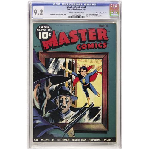 <B>Master Comics #48 Crowley Copy/File Copy (Fawcett, 1944) CGC NM- 9.2 Cream to off-white pages.</B></I> First appearance of Bulletboy. Captain Marvel makes a cameo appearance in the Minute-Man story. Mac Raboy cover. Checking Copy stamp on cover. Overstreet 2006 NM- 9.2 value = $600. CGC census 10/06: 2 in 9.2, 1 higher.<BR><BR><b>Shipping:</b> Slabbed Comic (<a target="_blank" href="http://www.heritageauctions.com/common/shipping.php">view shipping information</a>)