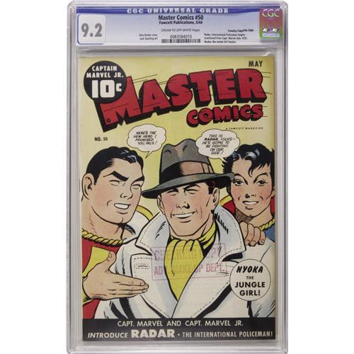 <B>Master Comics #50 Crowley Copy/File Copy (Fawcett, 1944) CGC NM- 9.2 Cream to off-white pages.</B></I> Radar and Nyoka begin their title runs. Jack Sparling art. Checking Copy stamp on cover. Overstreet 2006 NM- 9.2 value = $525. CGC census 10/06: 2 in 9.2, none higher.<BR><BR><b>Shipping:</b> Slabbed Comic (<a target="_blank" href="http://www.heritageauctions.com/common/shipping.php">view shipping information</a>)
