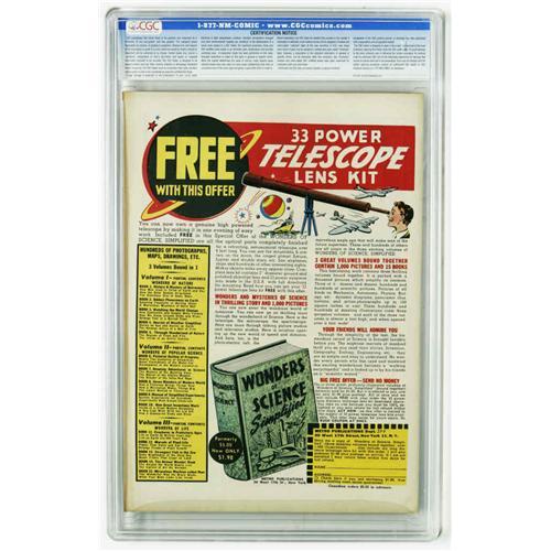 <B>Master Comics #51 Crowley Copy pedigree - File Copy (Fawcett, 1944) CGC NM- 9.2 Cream to off-white pages.</B></I> Captain Marvel Jr. points out the target for tonight on this "keep 'em flying" World War II cover by Mac Raboy. Next stop -- Tokyo! "Checking Copy" has been lightly rubber-stamped on the front cover of this attractive, glossy, pedigreed example. Overstreet 2005 NM- 9.2 value = $265. CGC census 12/05: 1 in 9.2, none higher.