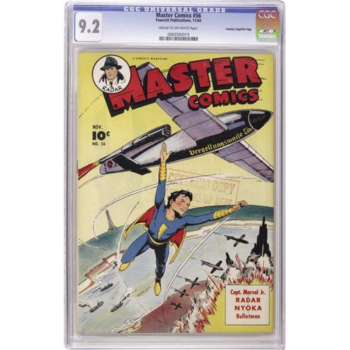 <B>Master Comics #56 Crowley Copy/File Copy (Fawcett, 1944) CGC NM- 9.2 Cream to off-white pages.</B></I> Mac Raboy cover. Overstreet 2006 NM- 9.2 value = $275. CGC census 10/06: 1 in 9.2, none higher.<BR><BR><b>Shipping:</b> Slabbed Comic (<a target="_blank" href="http://www.heritageauctions.com/common/shipping.php">view shipping information</a>)