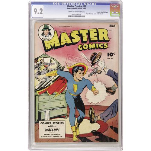 <B>Master Comics #61 Crowley Copy/File Copy (Fawcett, 1945) CGC NM- 9.2 Cream to off-white pages.</B></I> Captain Marvel Jr. meets Uncle Marvel. Overstreet 2006 NM- 9.2 value = $300. CGC census 10/06: 1 in 9.2, 1 higher.<BR><BR><b>Shipping:</b> Slabbed Comic (<a target="_blank" href="http://www.heritageauctions.com/common/shipping.php">view shipping information</a>)