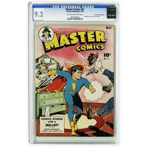 <B>Master Comics #61 Crowley Copy pedigree - File Copy (Fawcett, 1945) CGC NM- 9.2 Cream to off-white pages.</B></I> "Comic Stories with a Wallop!" That's what the cover blurb on this issue says, and we don't wish to argue! In this issue, Captain Marvel Jr. meets Uncle Marvel. A light "Checking Copy" stamp appears on the front cover to this sharp example from Fawcett editor Wendell Crowley's collection. Overstreet 2005 NM- 9.2 value = $290. CGC census 12/05: 1 in 9.2, 1 higher.