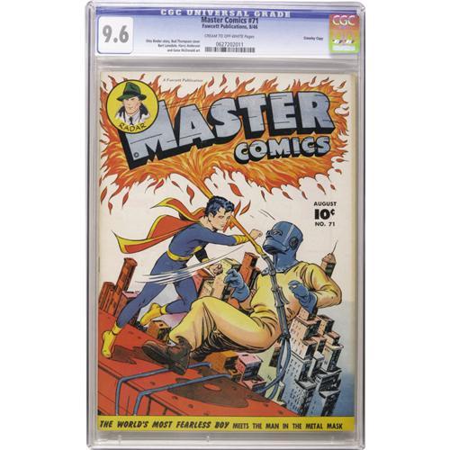 <B>Master Comics #71 Crowley Copy pedigree (Fawcett, 1946) CGC NM+ 9.6 Cream to off-white pages.</B></I> Bud Thompson cover. Harry Anderson art. Overstreet 2006 NM- 9.2 value = $210. CGC census 10/06: 1 in 9.6, none higher.<BR><BR><b>Shipping:</b> Slabbed Comic (<a target="_blank" href="http://www.heritageauctions.com/common/shipping.php">view shipping information</a>)