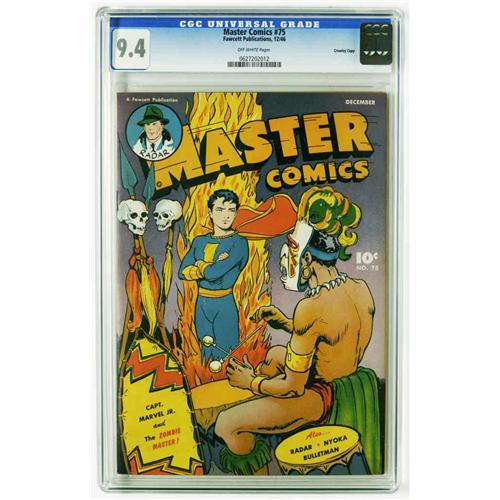 <B>Master Comics #75 Crowley Copy pedigree (Fawcett, 1946) CGC NM 9.4 Off-white pages.</B></I> Captain Marvel Jr. goes up against the Zombie Master on this issue's blazing hot cover. <I>Juju</B></I>! This fresh-looking example comes from former Fawcett editor Wendell Crowley's personal collection. Overstreet 2005 NM- 9.2 value = $200. CGC census 12/05: 2 in 9.4, none higher.