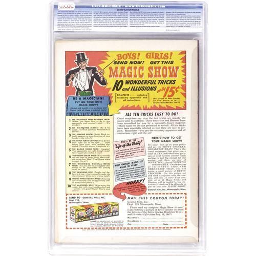 <B>Master Comics #75 Davis Crippen ("D" Copy) pedigree (Fawcett, 1946) CGC NM 9.4 Off-white pages.</B></I> Captain Marvel Jr. and a zombie master make for some great visuals; we wish we knew which artist illustrated the skull session! Junior is joined inside the issue by Fawcett stalwarts Bulletman, Radar, and Nyoka the Jungle Girl. Overstreet 2006 NM- 9.2 value = $210. CGC census 6/06: 2 in 9.4, none higher. <I>From the Crippen Collection.</B></I> <BR><BR><B>Important notice:</B> Heritage usually auctions material at the rate of 200-250 lots per hour. On some occasions eBay Live bid software or the Internet may not be able to keep up with the pace of the auction. We recommend placing a realistic absentee bid now as insurance to avoid disappointment. Occasionally the auctioneer may eliminate or reject an eBay Live bid, and the auctioneer may also reopen a lot after the close of the eBay live bidding (usually because we missed an audience bid), and may reject your bid even if it shows you as the winning bidder. By bidding via eBay Live, you agree that Heritage may award the lot to another bidder at its sole discretion under the circumstances described above or any other reasonable circumstances. Since eBay bids are not shown to us until we open the lot on the floor, we treat those bids just like floor bids. In most cases the floor responds before the eBay bid is presented to us, due to Internet lag time, so for consistency we have made it a policy that floor bids are always considered first over tie eBay live bids. Also please note that all Heritage lots purchased through eBay Live carry a 22.5% Buyer's Premium. Please make sure you read the Terms and Conditions before you bid. This lot is being auctioned in conjunction with a live floor auction by Heritage Auction Galleries. All final auction and invoice information will be supplied by Heritage Auction Galleries, and all other information should be considered preliminary. Lot:41001 <BR><BR><B>Winning Notification and Billing:</B> After the FINAL session in this auction is complete, Heritage will send e-mail and snail mail invoices. This process normally takes several days. All final auction and invoice information will be supplied by Heritage Auction Galleries, and all other information should be considered preliminary. <BR><BR>This auction will be conducted on a live auction floor and over the Internet through eBay Live. If you choose to place an absentee bid, please take a moment to <font color='#0000ff'><u><a href='http://pages.ebay.com/liveauctions/help/before/laabsentee.html'>learn how eBay Live absentee bidding works</a></u></font><font color='#000000'>