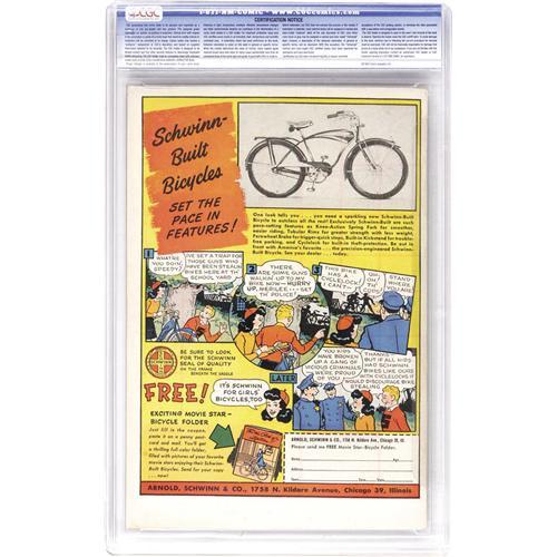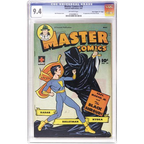 <B>Master Comics #79 Davis Crippen ("D" Copy) pedigree (Fawcett, 1947) CGC NM 9.4 Off-white pages.</B></I> Captain Marvel Jr. is joined in this issue by Bulletman, Nyoka the Jungle Girl, Radar (who rates <I>two</B></I> cover mentions), and also the wacky antics of "Richard Richard, Private Dick" (no cover mention for him, though). The cover art is credited to Bud Thompson. Overstreet 2006 NM- 9.2 value = $210. CGC census 6/06: 1 in 9.4, 1 higher. <I>From the Crippen Collection.</B></I> <BR><BR><B>Important notice:</B> Heritage usually auctions material at the rate of 200-250 lots per hour. On some occasions eBay Live bid software or the Internet may not be able to keep up with the pace of the auction. We recommend placing a realistic absentee bid now as insurance to avoid disappointment. Occasionally the auctioneer may eliminate or reject an eBay Live bid, and the auctioneer may also reopen a lot after the close of the eBay live bidding (usually because we missed an audience bid), and may reject your bid even if it shows you as the winning bidder. By bidding via eBay Live, you agree that Heritage may award the lot to another bidder at its sole discretion under the circumstances described above or any other reasonable circumstances. Since eBay bids are not shown to us until we open the lot on the floor, we treat those bids just like floor bids. In most cases the floor responds before the eBay bid is presented to us, due to Internet lag time, so for consistency we have made it a policy that floor bids are always considered first over tie eBay live bids. Also please note that all Heritage lots purchased through eBay Live carry a 22.5% Buyer's Premium. Please make sure you read the Terms and Conditions before you bid. This lot is being auctioned in conjunction with a live floor auction by Heritage Auction Galleries. All final auction and invoice information will be supplied by Heritage Auction Galleries, and all other information should be considered preliminary. Lot:41001 <BR><BR><B>Winning Notification and Billing:</B> After the FINAL session in this auction is complete, Heritage will send e-mail and snail mail invoices. This process normally takes several days. All final auction and invoice information will be supplied by Heritage Auction Galleries, and all other information should be considered preliminary. <BR><BR>This auction will be conducted on a live auction floor and over the Internet through eBay Live. If you choose to place an absentee bid, please take a moment to <font color='#0000ff'><u><a href='http://pages.ebay.com/liveauctions/help/before/laabsentee.html'>learn how eBay Live absentee bidding works</a></u></font><font color='#000000'>