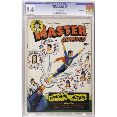 <B>Master Comics #83 Crowley Copy pedigree (Fawcett, 1947) CGC NM 9.4 Off-white pages.</B></I> Bright, white cover copy. Overstreet 2006 NM- 9.2 value = $180. CGC census 10/06: 1 in 9.4, 1 higher.<BR><BR><b>Shipping:</b> Slabbed Comic (<a target="_blank" href="http://www.heritageauctions.com/common/shipping.php">view shipping information</a>)