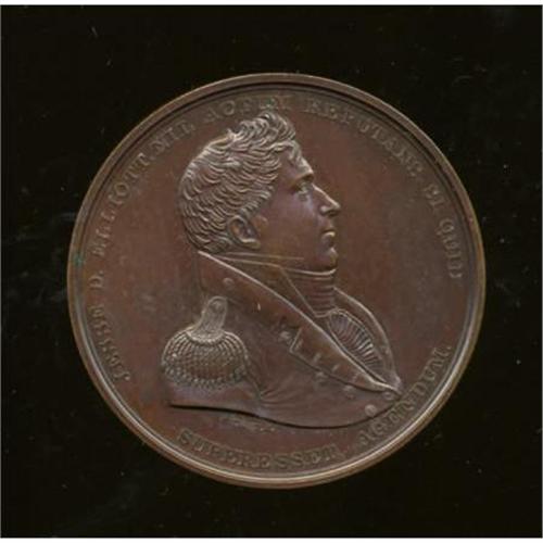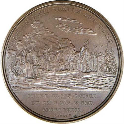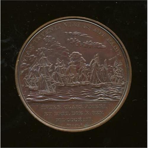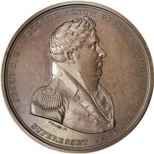 <B>Master Commander Jesse D. Elliott Naval Medal, Julian-NA-10, MS65 NGC.</B></I> Bronzed copper, 65 mm, 232.1 gm. Dies by Moritz Furst. Obverse legend around JESSE D. ELLIOTT. NIL ACTUM REPUTANS SI QUID SUPERESSET AGENDUM ("Jesse D. Elliott. Considering nothing to have been done, if aught remains to be accomplished"), FURST.F. in field below bust. Reverse around and in exergue VIAM INVENIT VIRTUS AUT FACIT / INTER CLASS. AMERI. ET BRIT. DIE X SEP. MDCCCXIII ("Virtue finds or makes a way / Between the fleets of America and Britain September 10, 1813"), FURST.F. below.<BR> This glossy Gem boasts splendid original mint luster over mahogany-brown surfaces tinged with peripheral accents of pinkish-purple and ice-blue. Mentionable impairments are expectedly few. An NGC Photo Certificate accompanies. A Choice AU piece in the Kessler-Spangenberger sale (NASCA, 4/1981, lot 1699) brought $110.<BR><BR><b>Shipping:</b> Coins & Currency (<a target="_blank" href="http://www.heritageauctions.com/common/shipping.php">view shipping information</a>)