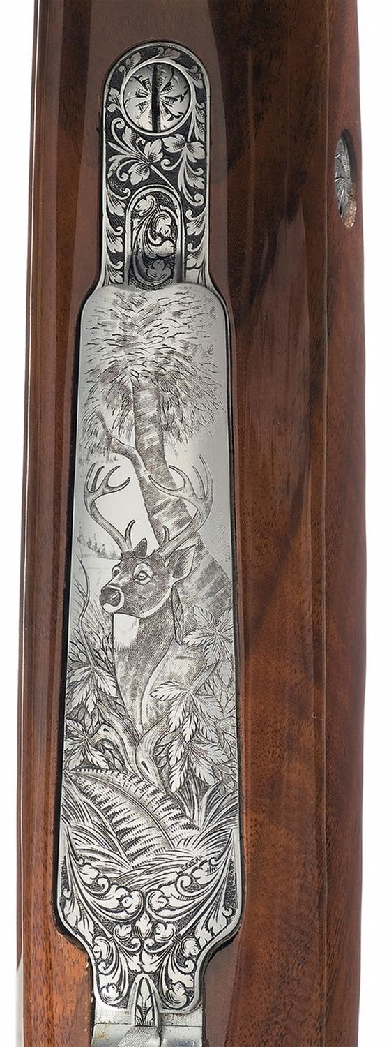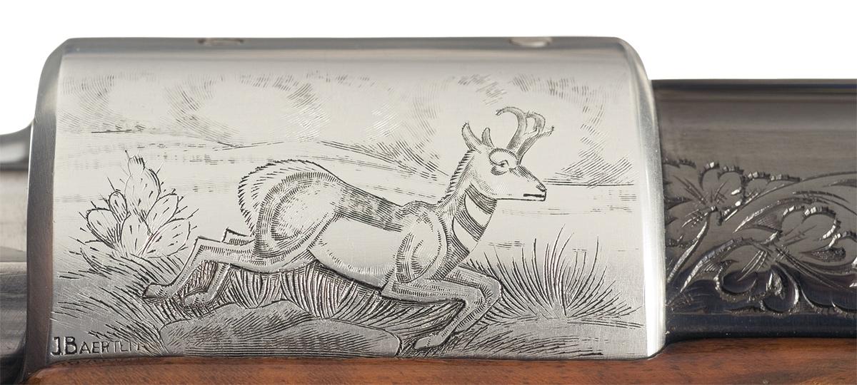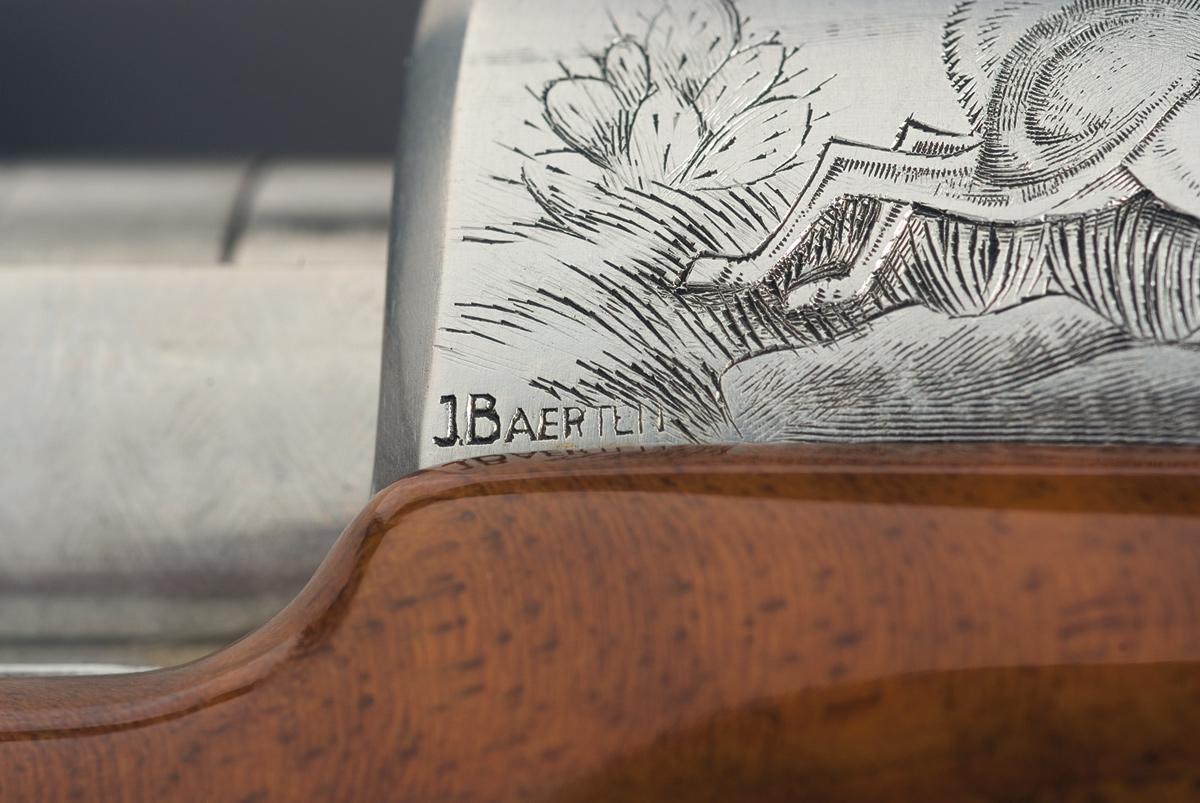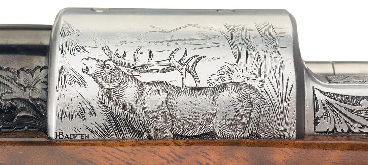 This rifle features a blue barrel manufactured without sights and French grey finish on the remaining parts. The top of the receiver has been factory drilled and tapped for scope mounting. The follower and bolt are polished with a jeweled extractor, and the trigger is gold washed. The front receiver ring is engraved with a bugling elk on the left side, a running deer on the right side and the remainder of the action is scroll leaf and punch dot engraved. Each side of the receiver is signed "J BAERTEN". The hinged floor plate is signed "LEGIERS" and is engraved with a deer in a wooded scene with floral scroll engraving below and on the attaching metal. The trigger guard is engraved with a bear. There is a two inch wedge of floral scroll engraving on each side of the breech end of the barrel. The screw heads and stock bolts are also engraved. The stock is extra fancy select walnut with a high gloss finish, fine line checkering and floral and punch dot hand carving on the forearm and grip area, contrasting forend and grip cap with a diamond shaped brass inset on the grip cap, raised comb, cheekpiece, plastic buttplate and sling swivel studs. Complete with a Browning hard case.