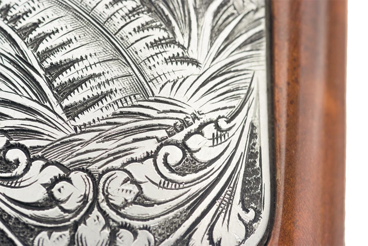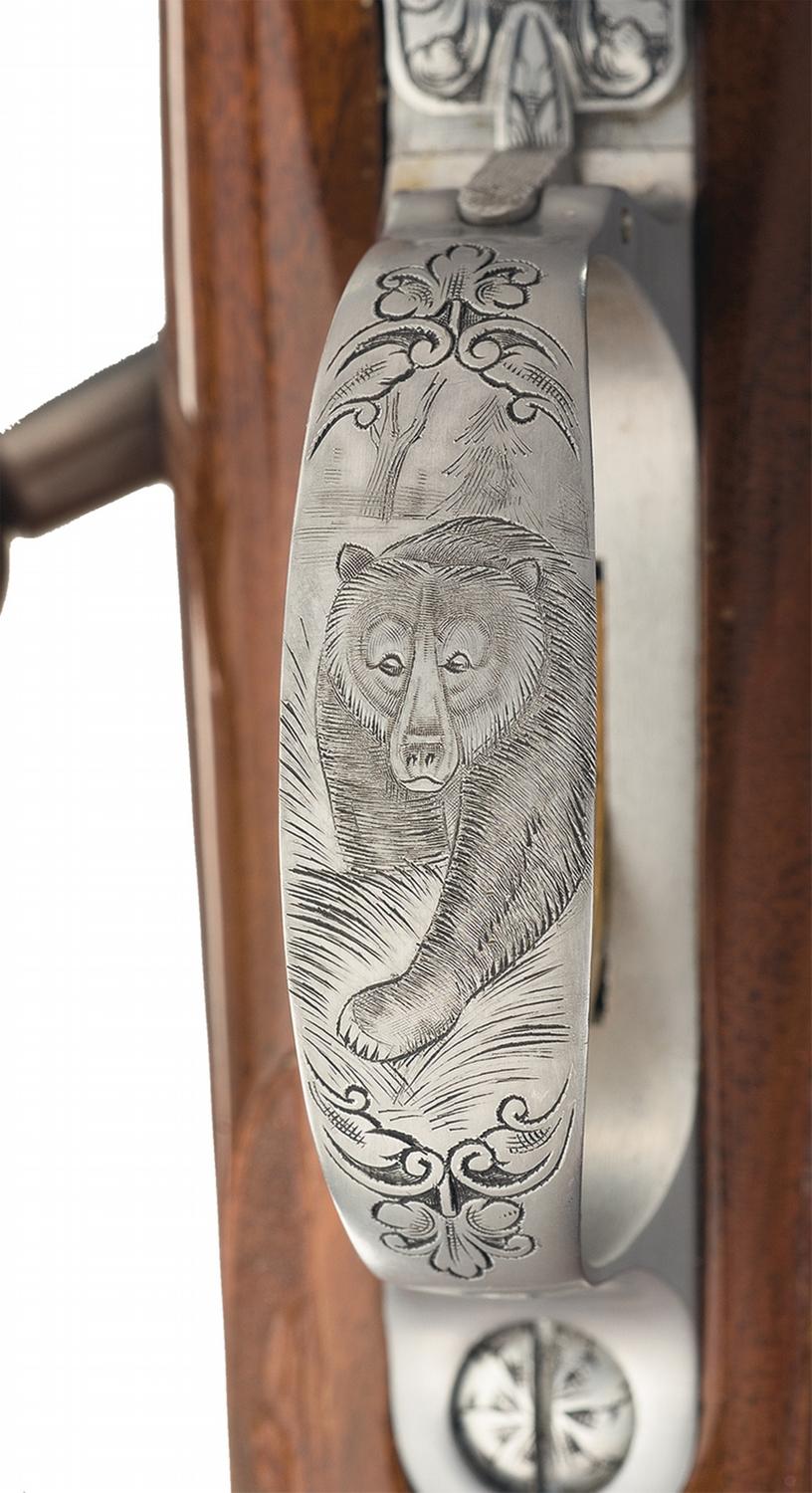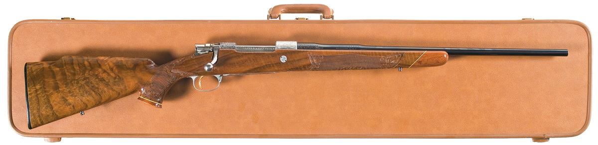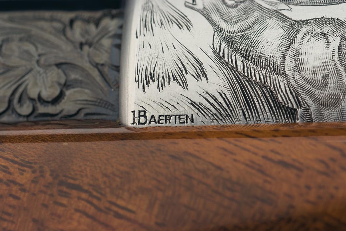 This rifle features a blue barrel manufactured without sights and French grey finish on the remaining parts. The top of the receiver has been factory drilled and tapped for scope mounting. The follower and bolt are polished with a jeweled extractor, and the trigger is gold washed. The front receiver ring is engraved with a bugling elk on the left side, a running deer on the right side and the remainder of the action is scroll leaf and punch dot engraved. Each side of the receiver is signed "J BAERTEN". The hinged floor plate is signed "LEGIERS" and is engraved with a deer in a wooded scene with floral scroll engraving below and on the attaching metal. The trigger guard is engraved with a bear. There is a two inch wedge of floral scroll engraving on each side of the breech end of the barrel. The screw heads and stock bolts are also engraved. The stock is extra fancy select walnut with a high gloss finish, fine line checkering and floral and punch dot hand carving on the forearm and grip area, contrasting forend and grip cap with a diamond shaped brass inset on the grip cap, raised comb, cheekpiece, plastic buttplate and sling swivel studs. Complete with a Browning hard case.