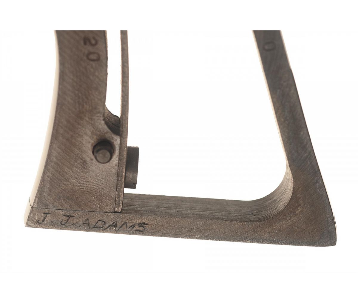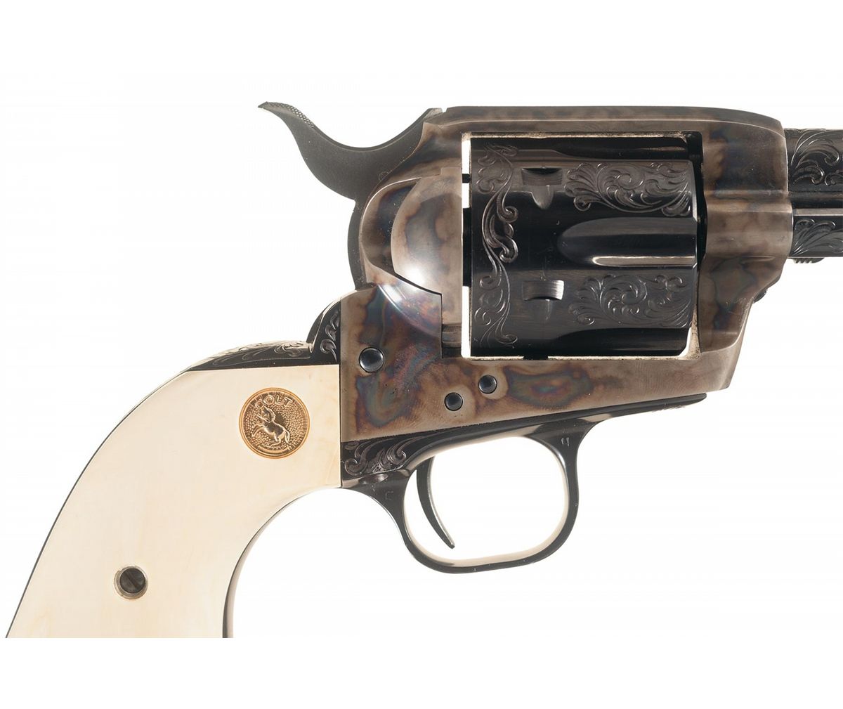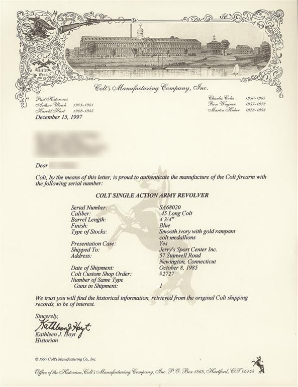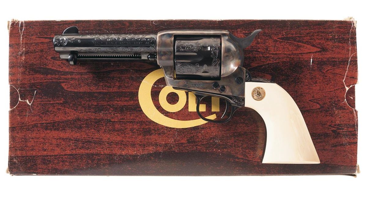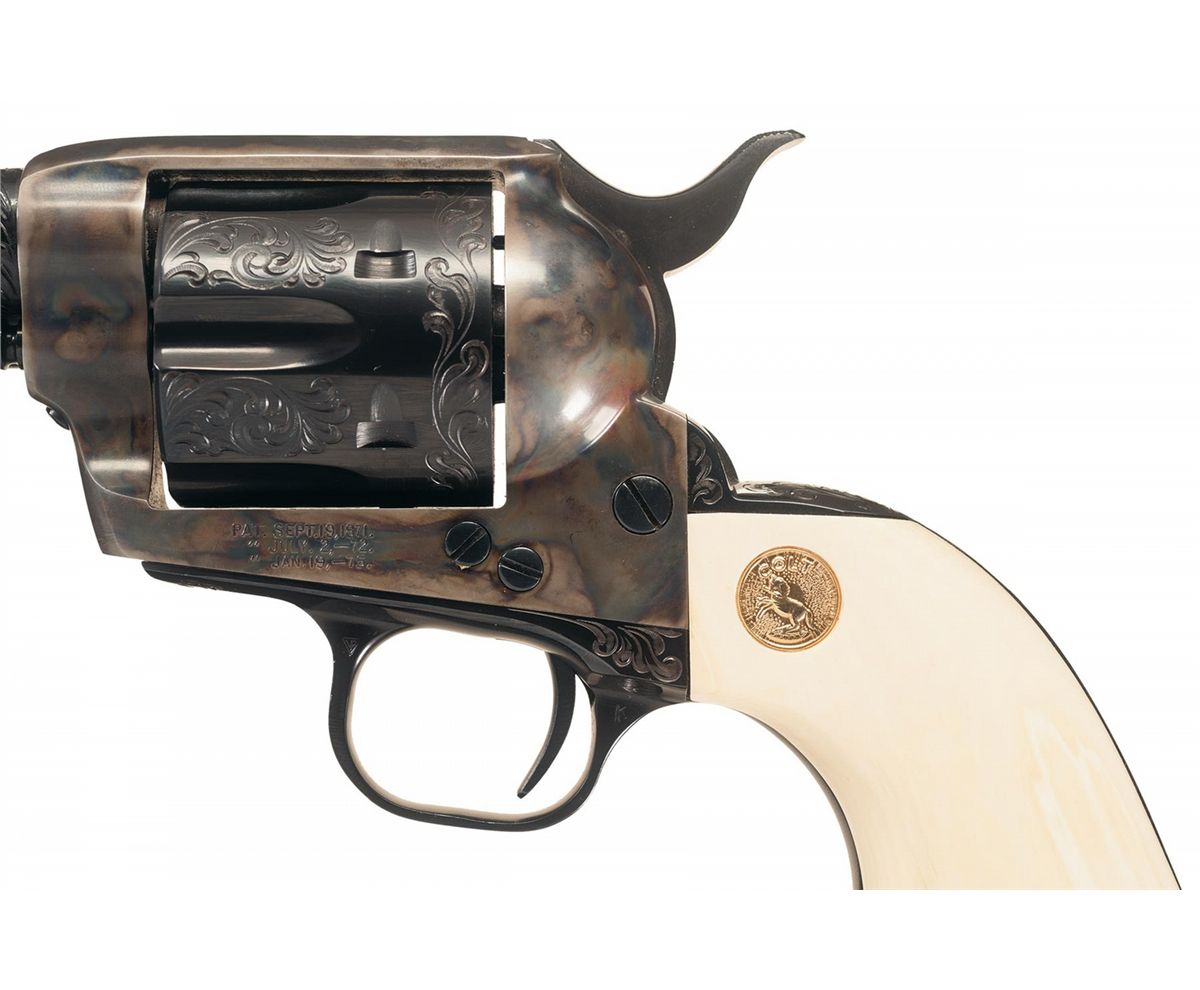 This Single Action Army revolver was engraved by Master Engraver J.J. Adams after it left the Colt factory. The factory letter confirms the caliber, barrel length, and smooth ivory grips with gold Colt Medallions and was originally shipped with a blue finish and presentation case. The revolver was shipped to Jerry's Sport Center Inc. of Newington, Connecticut on October 8, 1985 as a one gun shipment on order number 2727. The barrel retains the Colt Hartford address and caliber marking and the left side of the frame has the three line, three patent dates marking. The grip straps are numbered to the gun with Adams' signature on the left side under the grip. An attractive engraved scroll pattern appears on the barrel, ejector rod housing, cylinder and grip straps. The factory ivory grips are numbered to the gun and have gold Colt medallions. The Colt "woodgrain" box has a Colt Custom Gun Shop end label numbered to the gun and confirming the ivory grips.