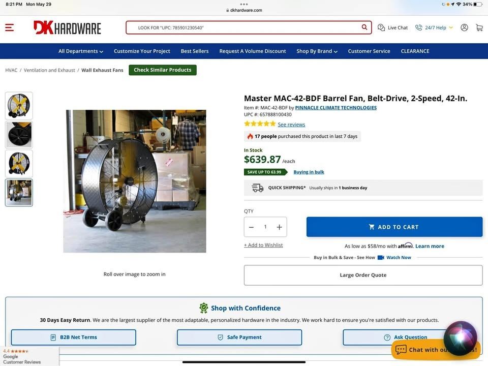 Master MAC-42-BDF Barrel Fan, Belt-Drive, 2-Speed, 42-In. - tested good working condition. Pickup in Surrey via appointment.