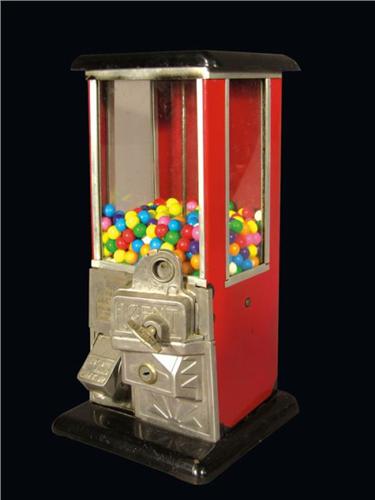 Master One Cent Gumball Machine, black and red. Pat. August 14, 1923, serial # 65029. Good original condition with keys. 16 inches tall.