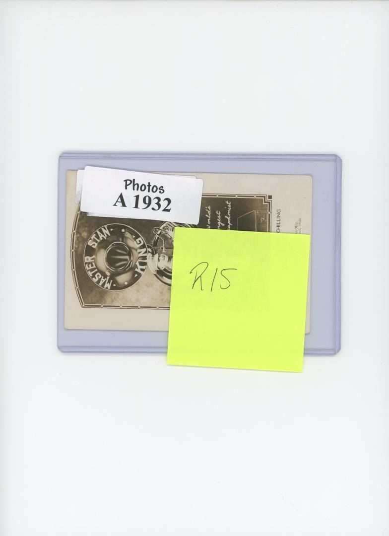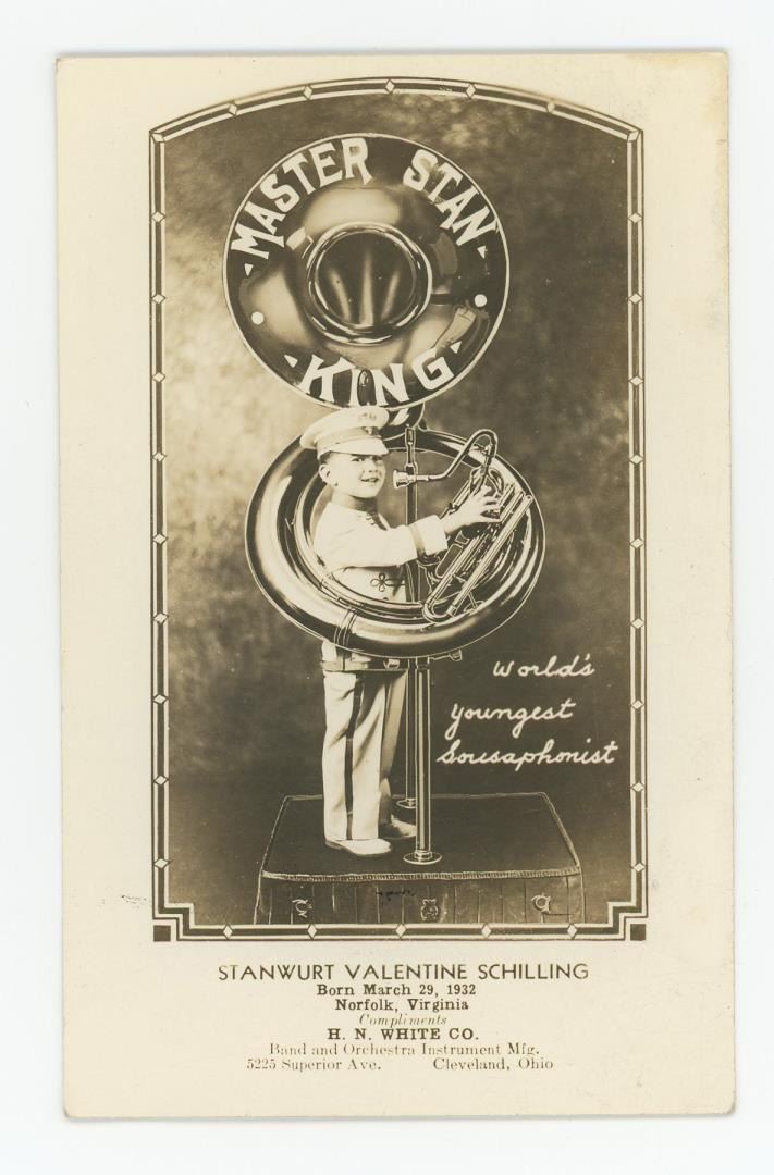 This postcard highlights Master Stan King, Stanwurt Valentine Schilling, labeled as the World's youngest Sousaphonist, holding a large tuba-like instrument designed by the H.N. White Company.