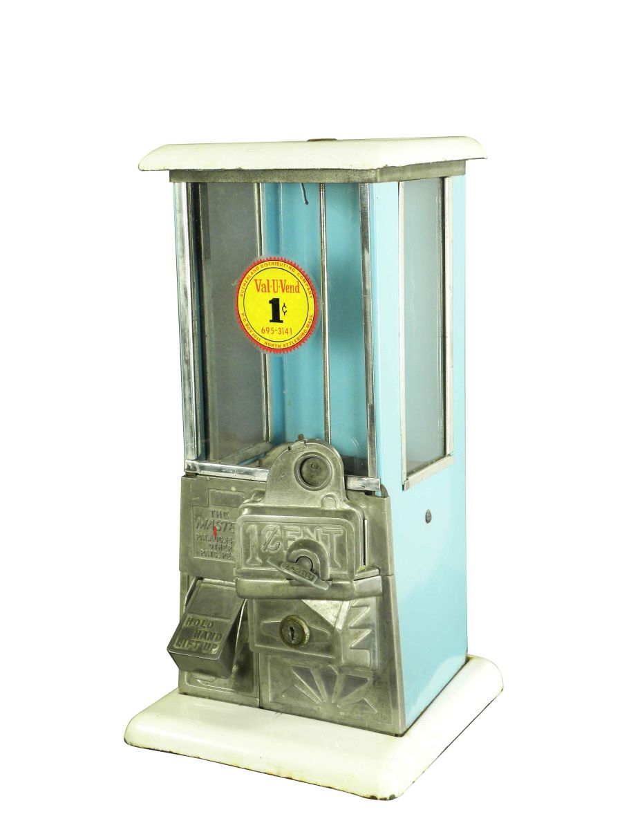 Master's Rare Blue Porcelain Gumball Machine. Coin-operated one cent. Very good original condition, comes with key. 16 inches tall.