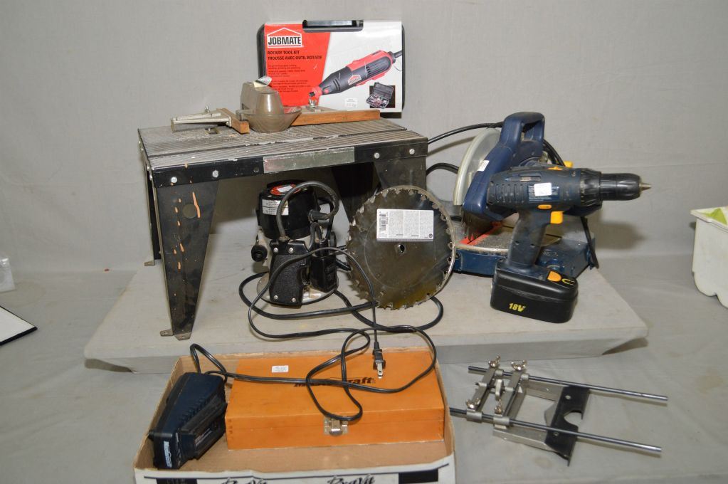 Mastercraft 8 1/4" compound mitre saw and Craftsman rotar with table, Jobmate rotary tools and Mastercraft set of router bits NIP and a rechargable Mastercraft drills