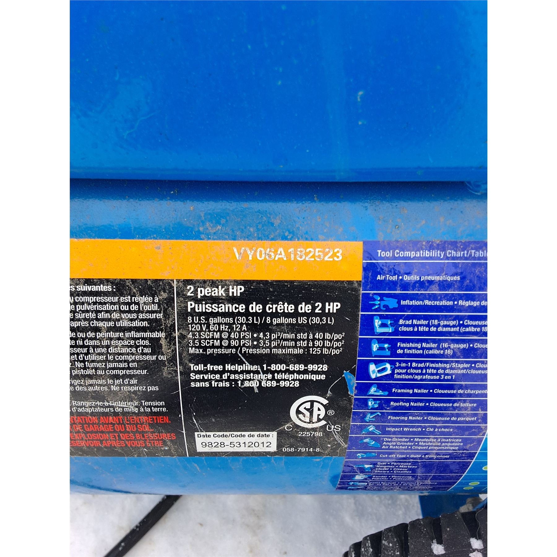 ** Mastercraft Air Compressor, Powers On, 2 HP, 8 Gallon Tank, Cannot Ship