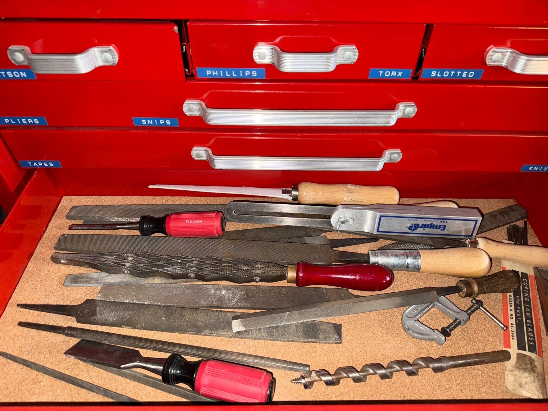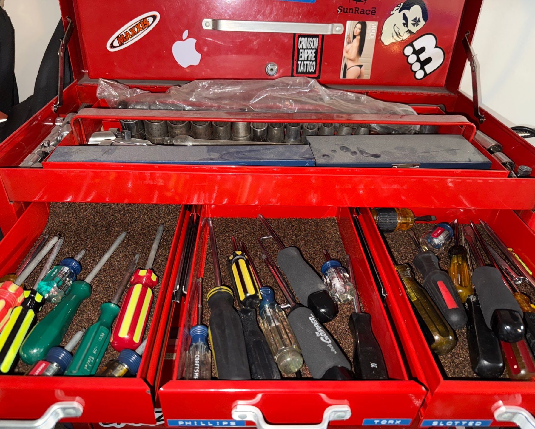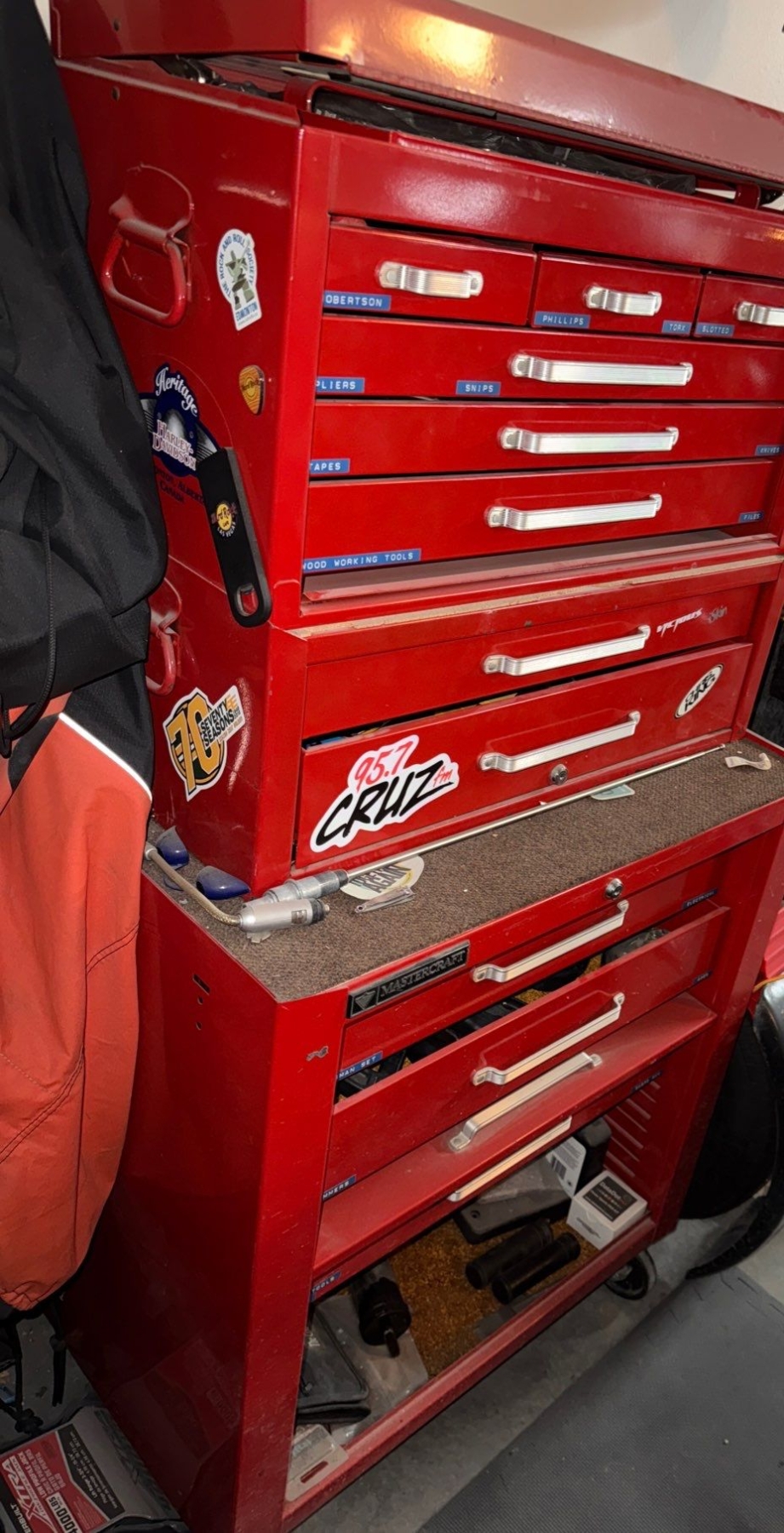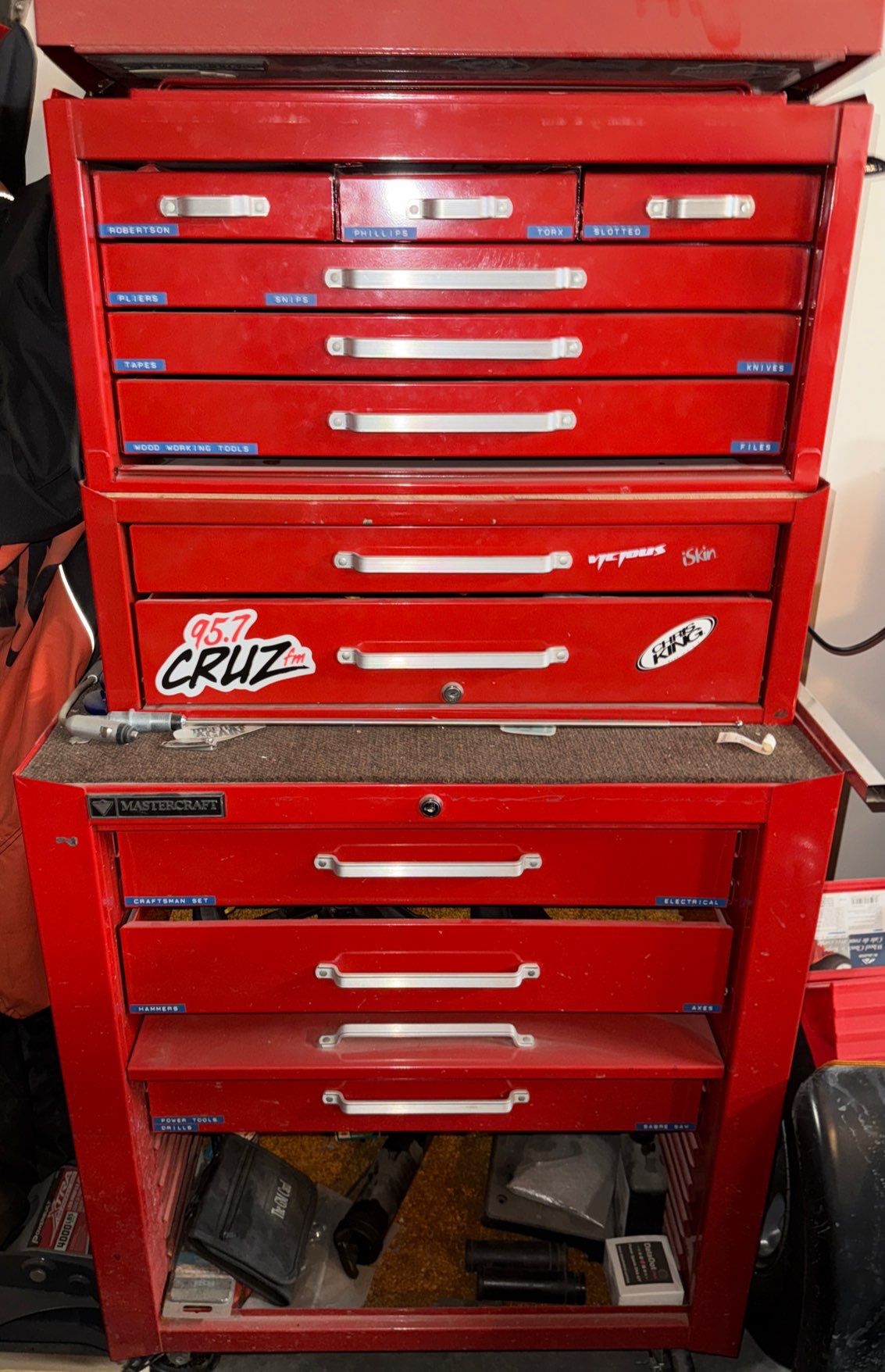 Mastercraft Rolling Tool Chest- Red Multiple Drawered Tool Box Full Of Various Tools & Garage Goodies
