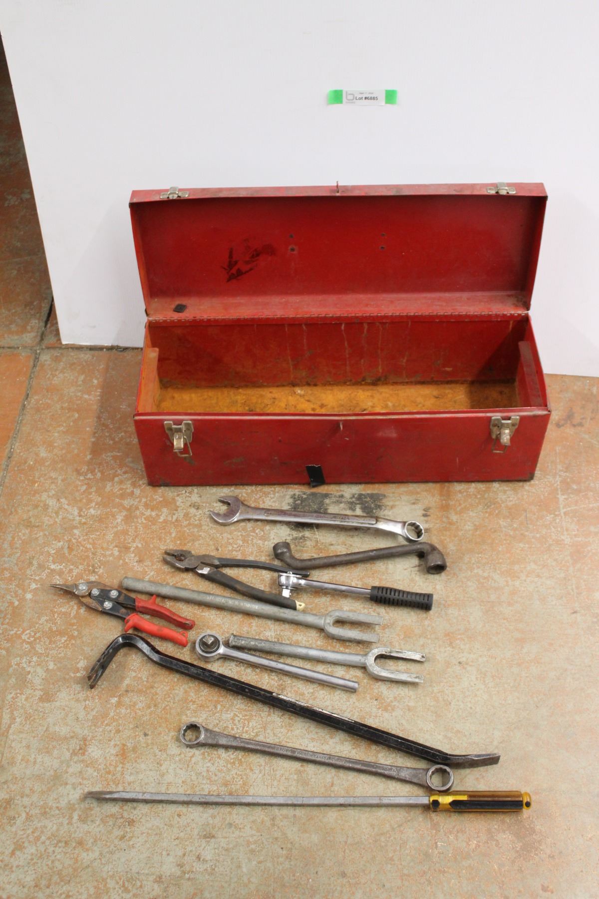 Mastercraft red Tool Box, Tin Snips, (2) Wrenches, Pickle Forks, Flathead Screwdriver, Assorted Tool
