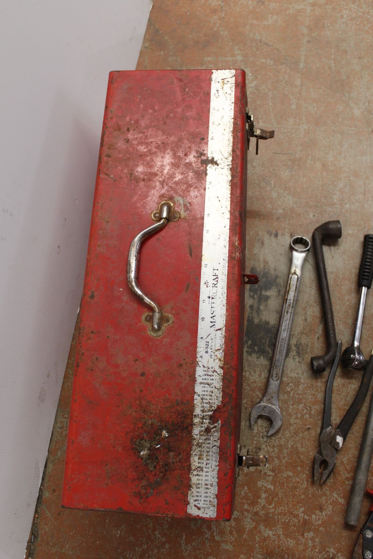 Mastercraft red Tool Box, Tin Snips, (2) Wrenches, Pickle Forks, Flathead Screwdriver, Assorted Tools