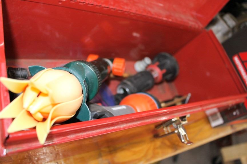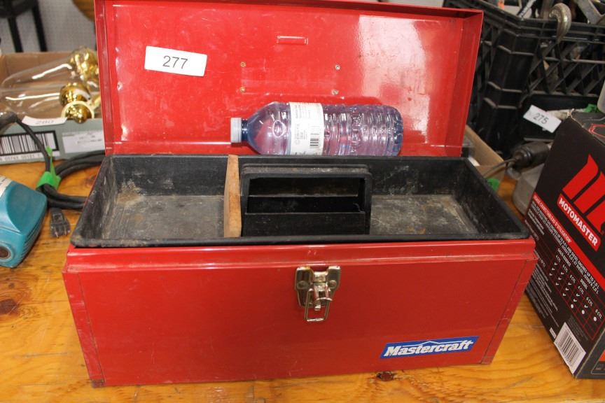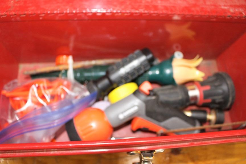 Mastercraft toolbox, screwdrivers, hose nozzle
