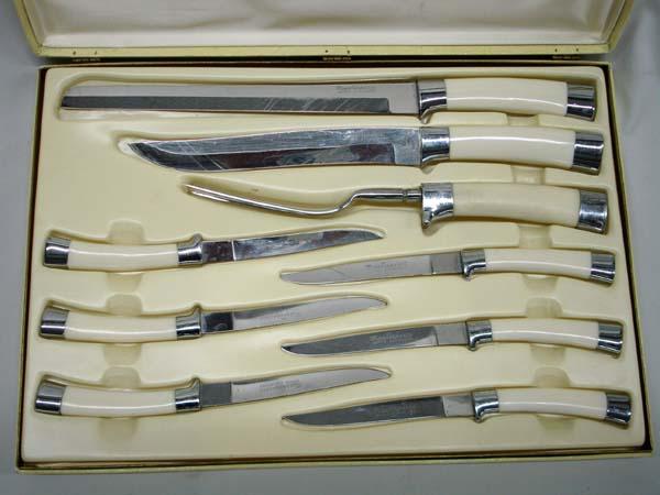 Masterpiece Stainless Steel Cutlery Set. The largest knife is 14'' long. The box measures 10.5''x15.5''. Blades are marked, ''Masterpiece Super Stainless'' on one side and ''Royal Brand Cutlery Company Japan'' on the other. Buyers Pay Actual Shipping and Handling Charges(see terms and conditions for more information).