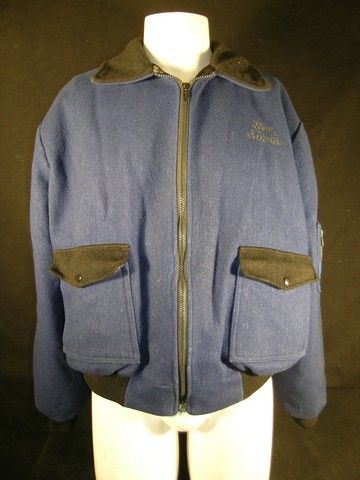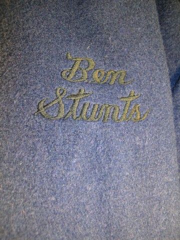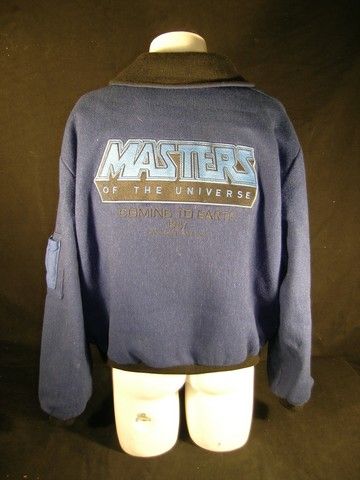 This is a crew jacket worn during the filming of the 1987 sci-fi fantasy film 'Masters of the Universe.' The size XL zippered jacket is made with dark blue and black wool with a metallic purple fabric inseam, and has an added pocket on the left arm sleeve for pens or markers. The jacket front has 'Ben Stunts' embroidered over the left pocket, likely referring to stuntman Ben Scott who worked on the film, and the reverse reads 'Masters of the Universe Coming to Earth 1987.' Label inside reads 'On Stage Design.'